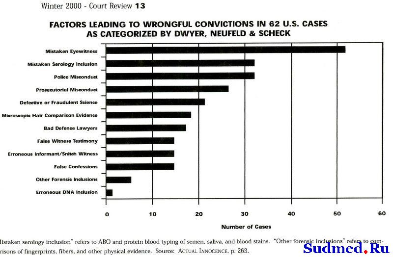 Какие ошибки выявляются в судебной биологии? Особенно отчётливо классифицировать ошибки стало возможным с появлением ДНК-анализа, применимого для проверки результатов судебной биологии? Суммируем наиболее распространённый ряд ошибок, допускаемых при проведении судебно-биологической экспертизы: 1. Групповая принадлежность по системе АВО в следах крови, слюны, спермы, костной ткани и др. установлена неверно (ошибка метода, аналогично другие системы анализа, например: гаптоглобин, MNSs). Выявлен лишний антиген/антигены (как правило, за счёт действия микрофлоры). Недовыявлен антиген/антигены из-за малого количества биологического материала. 2. Групповая принадлежность по системе АВО не установлена (недостаточна чувствительность и специфичность). 3. Видовая принадлежность не установлена. 4. Установлена либо группа, либо вид, но полностью израсходован биологический материал. Самые распространённые примеры: Тампоны и мазки с содержимым влагалища, прямой кишки, полости рта потерпевшей. Срезы ногтевых пластин со следами крови (подногтевое содержимое). Окурки сигарет. Жевательная резинка. Корневая и стержневая части волоса. Слабые следы крови (смывы слабовыраженных следов крови с места происшествия, замытые следы крови на предметах-вещественных доказательствах). 5. Цитологическое установление половой принадлежности следов биологического происхождения. Положительный выход – 5-15%. При проверке молекулярно-генетическими методами положительных случаев половая принадлежность не всегда подтверждается (ошибки цитологического определения). 6. Сравнительный анализ волос: микроскопическое исследование. 7. «Системная» ошибка серологии: групповые характеристики установлены правильно, но из-за смешанного характера пятен биологического материала возникает ошибка (например: человек, обладающий антигеном А, при смешении его крови с кровью (пот, слюна, др.), в которой есть антиген В - даст новую группу: АВ). В смешанных следах присутствие представителя I-ой группы (Оαβ) никогда не исключается. Принципиально биологическими методами нельзя отдифференцировать смешанные следы. К чему способны привести эти ошибки становится очевидным из аналитических документов служб юстиции США (есть и данные по другим странам, но наиболее показательны и систематизированы именно данные по США). ADDITIONAL DATA (Source: Scheck et. al 2001) Factors Leading to Wrongful Conviction: • 81% of time - Mistaken Identification by eyewitnesses • 51% of time - Serology Errors (ABO, protein blood typing) • 50% of time - Police Misconduct • 45% of time - Prosecutorial Misconduct • 35% of time - Forensic Hair Comparison Errors • 34% of time - Junk/Sloppy Science admitted at trial • 32% of time - Bad Lawyering • 22% of time - False Confessions • 20% of time - Deliberately False witness testimony • 19% of time - Deliberately False snitching by informants • 7% of time - Other Forensic Science errors • 1% of time - DNA testing errors Графическое изображение аналогичных данных дано на представленном рисунке. Следует учесть, что это только та часть ошибок, которая привела к незаслуженному осуждению судебной системой, вынесением обвинения на основании данных улик. Сотни тысяч долларов ежегодно тратятся в США на то, чтобы перепроверять с помощью ДНК-анализа полученные ранее серологические и другие данные. Это специальные программы, под которые выделяются федеральные деньги и деньги штатов. При всей критике, зачастую небезосновательной критике, правоохранительной системы США, нельзя не признать, что в области соблюдения прав человека – она уш