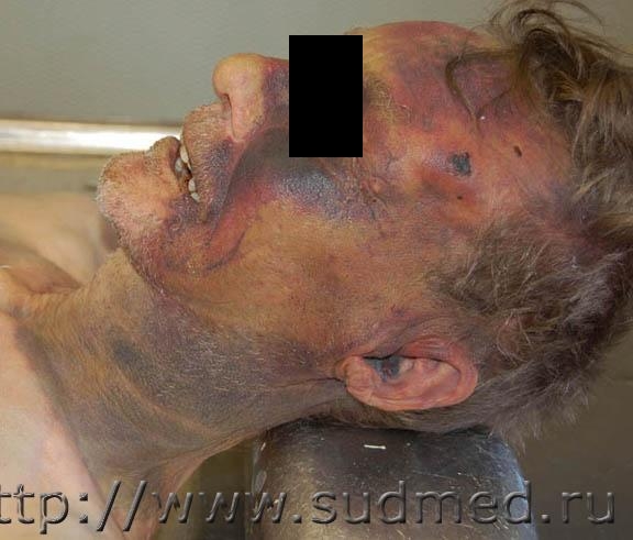 Я хотел обратить внимание на распространеность кровоподтеков на голове и шее (в т.ч. их наличие на спинке носа, ушной раковине) и утверждение, что они являются результатом одного (а не нескольких) травмирующего воздействия в лобную области слева. Я и у живых в травматологии видел, когда в первый день приходят с гематомкой на лбу, а на след день она распространяется на височную и скуловую области. Ну и соответственно в течение последующих дней эта штука занимает пол лица с цветением всеми цветами радуги)) |