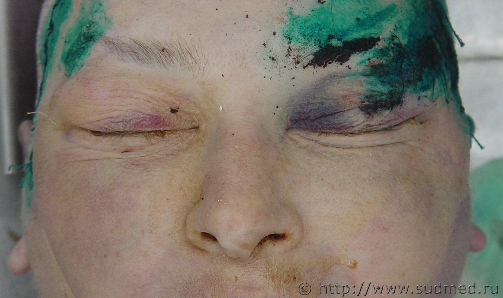 По фотографиям могу предположить, что тело мертвое, в положении лежа, голова на подголовнике, раны хирургически обработаны, с использованием дезинфекционных растворов (их следы видны на коже), свод и основание черепа с переломами, смерть наступила, вероятно в больнице. Нижняя челюсть была посмертно подвязана У-образной повязкой. У меня встречные вопросы: Когда пострадавшая была принята в больницу? Сколько жила в больнице? Сколько времени прошло от момента констатации смерти до фотографирования (наружный осмотр)? Нет ли признаков посмертного подсыхания кожи? Над левым глазом, по-моему, не корка на ране, а засохшая кровь. Кровоподтек на спине перекрывается с трупным пятном. |