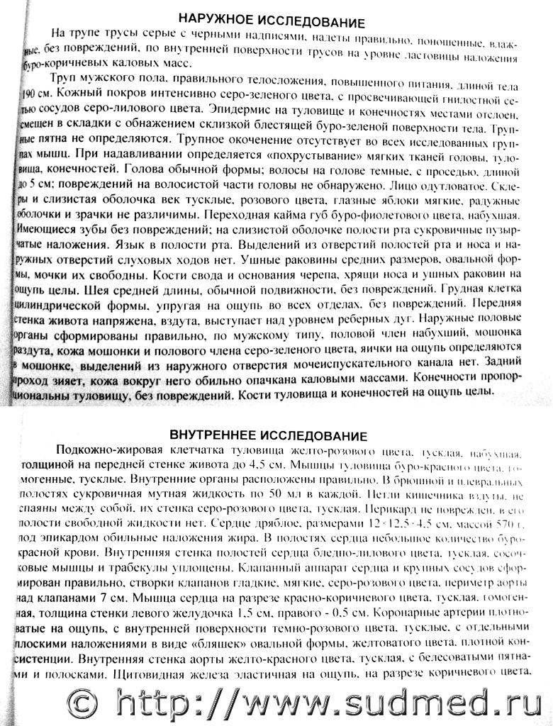 На трупе трусы серые с черными надписями, надеты правильно, поношенные, влажные, без повреждений, по внутренней поверхности трусов на уровне ластовицы наложения буро-коричневых каловых масс. Труп мужского пола, правильного телосложения, повышенного питания, длиной тела 190 см. Кожный покров интенсивно серо-зеленого цвета, c просвечивающей гнилостной сетью сосудов серо-лилового цвета. Эпидермис на туловище и конечностях местами отслоен, смещен в складки с обнажением склизкой блестящей буро-зеленой поверхности тела. Трупные пятна не определяются. Трупное окоченение отсутствует во всех исследованных группах мышц. При надавливании определяется «похрустывание» мягких тканей головы, туловища, конечностей. Голова обычной формы; волосы на голове темные, с проседью, длиной до 5 см.; повреждений на волосистой части головы не обнаружено. Лицо одутловатое. Склеры и слизистая оболочка век тусклые, розового цвета, глазные яблоки мягкие, радужные оболочки и зрачки не различимы. Переходная кайма губ буро-фиолетового цвета, набухшая. Имеющиеся зубы без повреждений; на слизистой оболочке полости рта сукровичные пузырчатые наложения. Язык в полости рта. Выделений из отверстий полости рта и носа и наружных отверстий слуховых ходов нет. Ушные раковины средних размеров, овальной формы, мочки их свободны. Кости свода и основания черепа, хрящи носа и ушных раковин на ощупь целы. Шея средней длины, обычной подвижности, без повреждений. Грудная клетка цилиндрической формы, упругая на ощупь во всех отделах, без повреждений. Передняя стенка живота напряжена, вздута, выступает над уровнем реберных дуг. Наружные половые органы сформированы правильно, по мужскому типу, половой член набухший, мошонка раздута, кожа мошонки и полового члена серо-зеленого цвета, яички на ощупь определяются в мошонке, выделений из наружного отверстия мочеиспускательного канала нет. Задний проход зияет, кожа вокруг него обильно опачкана каловыми массами. Конечности пропорциональны туловищу, без повреждений. Кости туловища и конечностей на ощупь целы. Внутреннее исследование Подкожно-жировая клетчатка туловища желто-розового цвета, тусклая, набухшая, толщиной на передней стенке живота до 4.5 см. Мышцы туловища буро-красного цвета, гомогенные, тусклые. Внутренние органы расположены правильно. В брюшной и плевральных полостях сукровичная мутная жидкость по 50 мл. в каждой. Петли кишечника вздуты, не спаяны между собой, их стенка серо-розового цвета, тусклая. Перикард не поврежден, в его полости свободной жидкости нет. Сердце дряблое, размерами 12x12.5x4.5 см. массой 570 г. под эпикардом обильные наложения жира. В полостях сердца небольшое количество буро-красной крови. Внутренняя стенка полостей сердца бледно-лилового цвета, тусклая, сосочковые мышцы и трабекулы уплощены. Клапанный аппарат сердца и крупных сосудов сформирован правильно, створки клапанов гладкие, мягкие, серо-розового цвета, периметр аорты над клапанами 7 см. Мышца сердца на разрезе красно-коричневого цвета, тусклая, гомогенная, толщина стенки левого желудочка 1.5 см., правого-0.5 см. Коронарные артерии плотноватые на ощупь, с внутренней поверхности темно-розового цвета, тусклые, с отдельными плоскими наложениями в виде «бляшек» овальной формы, желтоватого цвета, плотной консистенции. Внутренняя стенка аорты желто-кр