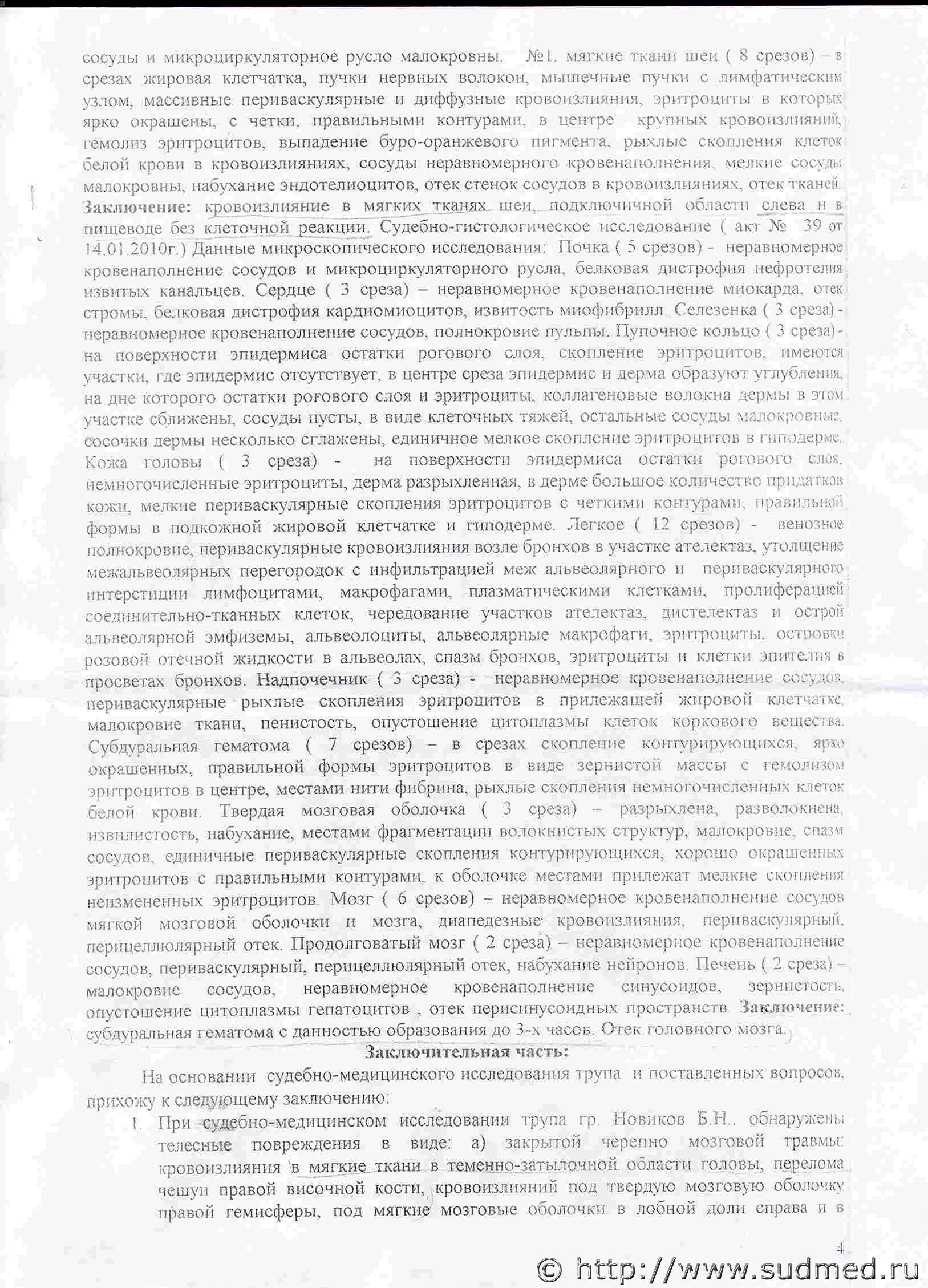 От кого его не было ? И почему он мог "быть" до результатов исследования, тем более при анамнезе грипа (ОРЗ) ? Вообще предмет для рассмотрения есть. Почитаем. Единственно (если на "листочках" этого не будет) сообщите даты: смерти, вскрытия, если известно - условия хранения тела до вскрытия. Спасибо за наводящие вопросы, пока мы ждем листики-копии по почте, могу только пояснить такие детали: когда заболела вся семья - с температурой высокой и т.д. - фельдшерица, вызванная к больным старшим детям, грудничка нашла здоровым, и его нужно было изолировать, наверное, не успели- заболела кормящая мама - эпидемия гриппа в семье явная... Милиция, приехавшая на вызов, сфотографировала на мобильный телефон умершего малыша. Хорошо бы эти снимки тоже исследовать, но все материалы дела очень труднодоступны: даже заявление на получение копии экспертизы у брата не принимали и не считают нужным "отчитываться" и что-то разъяснять, целенаправленно и "дружно" доказывается заключение "убийство". Брат разговаривал с экспертом, который делал вскрытие, отправлял(?) в область данные и узнал, что все анализы проводил самолично этот же судмедэксперт(районный), т.к. больше некому... замкнутый круг какой-то. Пятна -кровоизлияния на теле малыша - доказательства насильственной смерти? Ждем листики........... Еще раз спасибо всем за участие и помощь. |