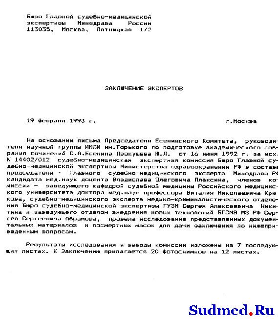 Когда я написал: " А нашим профессорам, по-видимому делать было нечего...", то имел ввиду именно что нечего было делать. Это не фигура речи. В те годы уже не было Бюро СМЭ РФСР, а созданный Центр никаким автритетом ни среди экспертов, ни среди правоохранительных органов не пользовался. А что касается "рекламы" - может быть себя они и пытались рекламировать, но уж никак не судебную медицину. С.С. Абрамов еще пытался проводить экспертизу для решения вопроса о убийстве или самоубийстве Маяковского - по характеру следов крови на ч/б фотографии. Это не реклама, а вящий позор. |