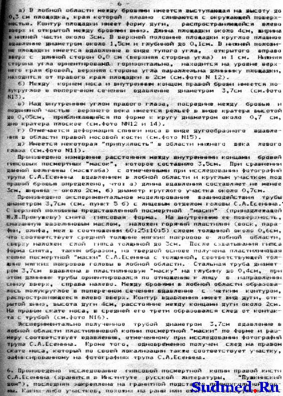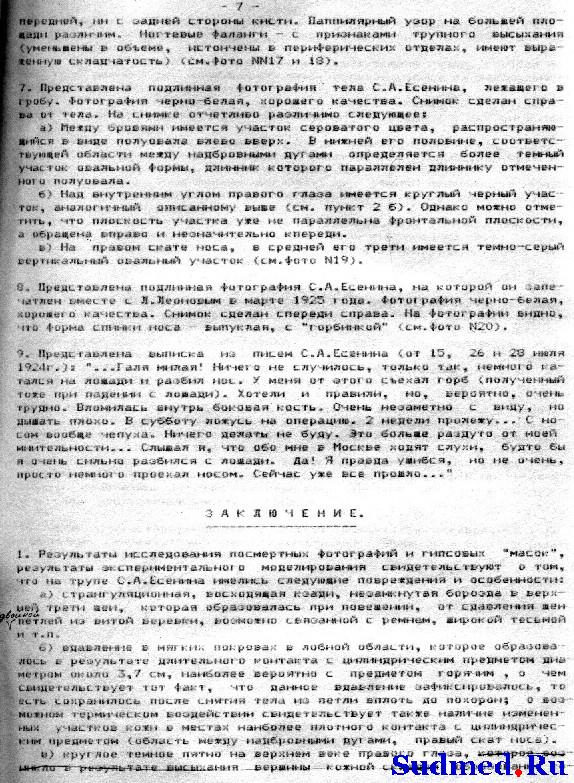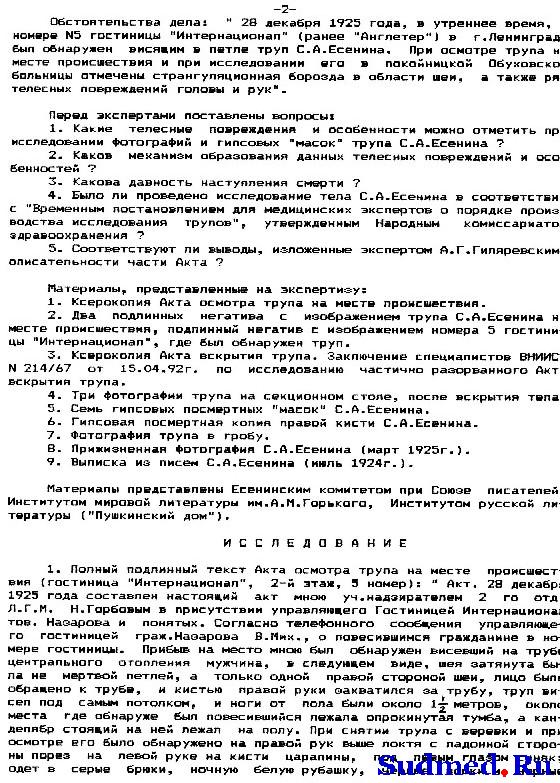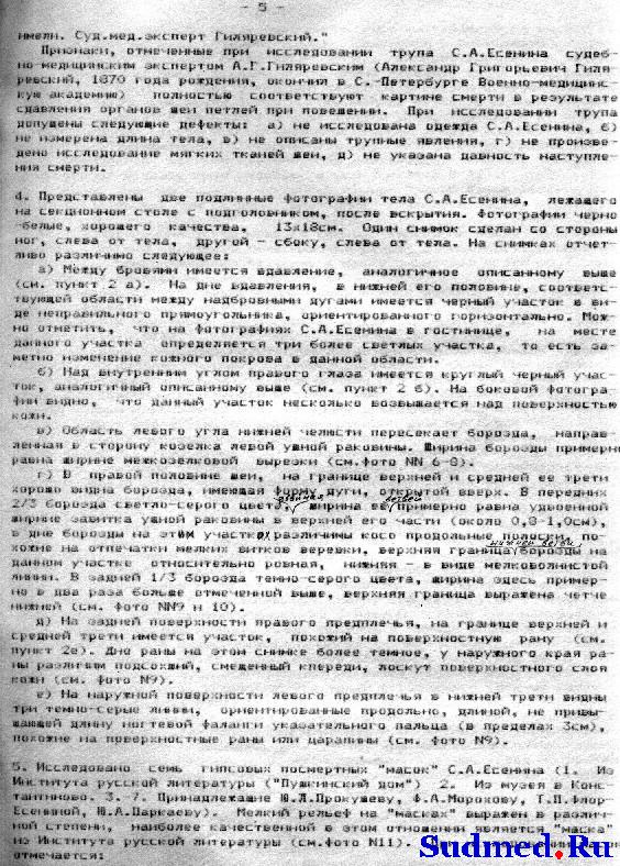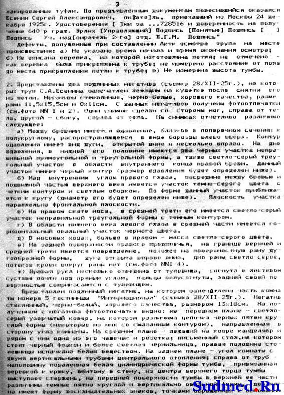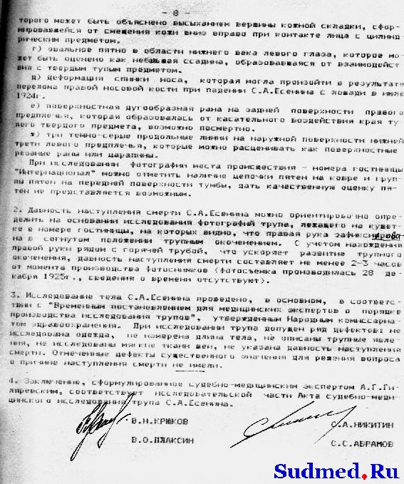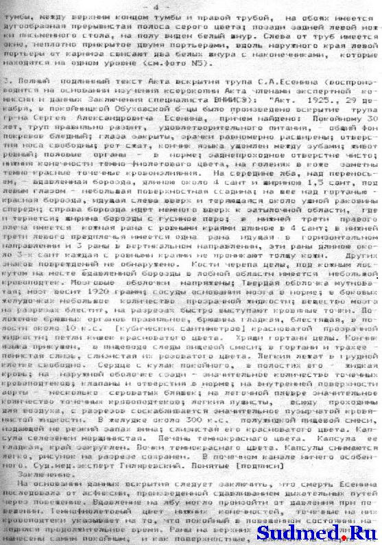 "АКТ 1925 г., 29 декабря, в покойницкой Обуховской б-цы было произведено вскрытие трупа гр-на Сергея Александровича Есенина, причем найдено: Покойному 30 лет, труп правильно развит, удовлетворительного питания, - общий фон покровов бледный, глаза закрыты, зрачки равномерно расширены; отверстия носа свободны; рот сжат; кончик языка ущемлен между зубами; живот ровный; половые органы - в норме; заднепроходное отверстие чисто; нижние конечности темно-фиолетового цвета, на голенях в коже заметны тёмно-красные точечные кровоизлияния. На середине лба, над переносьем, - вдавленная борозда длиною около 4 сант. и шириною 1 1/2 сант., под левым глазом - небольшая поверхностная ссадина; на шее над гортанью - красная борозда, идущая слева вверх и теряющаяся около ушной раковины спереди; справа борозда идет немного вверх к затылочной области, где и теряется; ширина борозды с гусиное перо; в нижней трети правого плеча имеется кожная рана с ровными краями длиною 4 сант.; в нижней трети левого предплечья имеется одна рана, идущая в горизонтальном направлении и 3 раны в вертикальном направлении, эти раны около 3-х сант. каждая с ровными краями [неразборчиво]... не проникают толщу кожи. Других знаков повреждений не обнаружено. Кости черепа целы, под кожным лоскутом на месте вдавленной борозды в лобной области имеется небольшой кровоподтек. Мозговые оболочки напряжены; твердая оболочка мутноватая; мозг весит 1920 грамм; сосуды основания мозга в норме; в боковых желудочках небольшое количество прозрачной жидкости; вещество мозга на разрезах блестит, на разрезах быстро выступают кровяные точки. Положение брюшных органов правильное, брюшина гладкая, блестящая, в полости около 10 к. с. [кубических сантиметров] красноватой прозрачной жидкости; петли кишек красноватого цвета. Хрящи гортани целы. Кончик языка прикушен, в пищеводе следы пищевой смеси; в гортани и трохее - пенистая слизь, слизистая их розоватого цвета. Легкие лежат в грудной клетке свободно. Сердце с кулак покойного, в полостях его - жидкая кровь; на наружной оболочке сзади - значительное количество точечных кровоподтеков; клапаны и отверстия в норме; на внутренней поверхности аорты - несколько сероватых бляшек; на легочной плевре значительное количество точечных кровоподтеков; легкие пушисты, всюду проходимы для воздуха, с разрезов соскабливается значительное пузырчатой кровянистой жидкости. В желудке около 300 к. с. полужидкой пищевой смеси, издающей не резкий запах вина; слизистая его красноватого цвета. Капсула селезенки морщинистая. Печень тёмно-красного цвета. Капсула ее гладкая, край закруглен. Почки тёмно-красного цвета. Капсулы снимаются легко, рисунок на разрезе сохранен. В почечном канале ничего особенного. Суд. мед. эксперт Гиляревский. ЗАКЛЮЧЕНИЕ На основании данных вскрытия следует заключить, что смерть Есенина последовала от асфиксии, произведенной сдавливанием дыхательных путей через повешение. Вдавление на лбу могло произойти от давления при повешении. Темнофиолетовый цвет нижних конечностей, точечные на них кровоподтеки указывают на то, что покойный в повешенном состоянии находился продолжительное время. Раны на верхних конечностях могли быть нанесены самим покойным, и как поверхностные, влияния насмерть не имели. Суд. мед. эксперт Гиляревский". |
