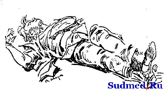 На рисунке изображен вытащенный из петли предпологаемый самоубийца, продолжительное время подвисевший на веревке, привязанной к вертикальной трубе, причем правой рукой ухватившись за эту трубу. Возможно ли, чтобы правая рука сохранила при этом вертикальном подвешании горизонтальное положение, не имея никакой опоры, а ноги, висевшие свободно, оказались скрещенными с раздвинутыми носками. Известно, что темно-фиолетовый цвет имели только нижнее конечности. Можно ли предположить, что труп был найден не вертикально повешенным, а в другом положении. Эскизы прикрепленных изображений |
