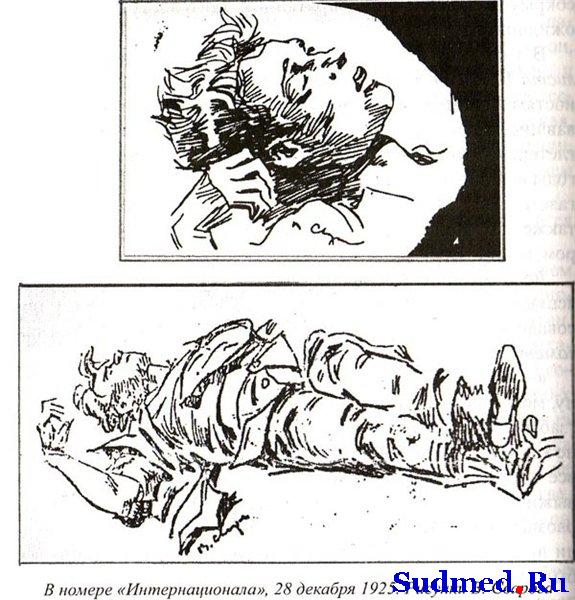 Приветствую всех! Я пишу в школе проект по смерти Есенина. Нашла в Интернете посмертные фотографии, акт Гиляревского, статьи. И все меня вроде устраивает, но в акте есть расхождение с фотографиями. У Есенина была поднята правая рука, приоткрыты губы ( в акте - сомкнуты), левый глаз плоский (рассказы современников), на лбу - повреждение, которое медики расценивают как ожог, на правой руке - порез, из которого он брал кровь для написания стихотворения (а писать чем - левой рукой? как зажимать?) Уважаемые, я очень хочу узнать вашу точку зрения на ваш счет, в городе я не смогла найти ни одного справочника по судебной медицине.