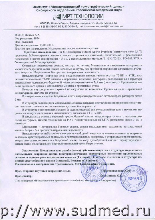 Стоит ли рассчитывать, что СМЭ поменяют мне вред здоровью с лёгкого на средней тяжести на основании заключения МТЦ от 05.11.11 г.? Вопрос №2. Или потребуется артроскопическое дообследование? Направление есть, но уж больно не хочется, чтобы во мне ковырялись лишний раз. На основании справки из ЦКБ СОРАН от 21.08.11 г. выдана справка Новосибирским областным бюро СМЭ от 29.08.11 г. На основании заключения МТЦ от 23.08.11 г. выдана справка СМЭ от 30.09.11 г. Двигаясь задним ходом, завалил меня на веле и переехал Лэндкрузёр весом 2.5 тонны по голени на асфальте. На данный момент нога в колене гнётся без заеданий и щелчков, но в глубоком приседе до конца не сгибается. После бега трусцой 5 км или ходьбы 10 км колено пару дней побаливает. Эскизы прикрепленных изображений Прикрепленные файлы