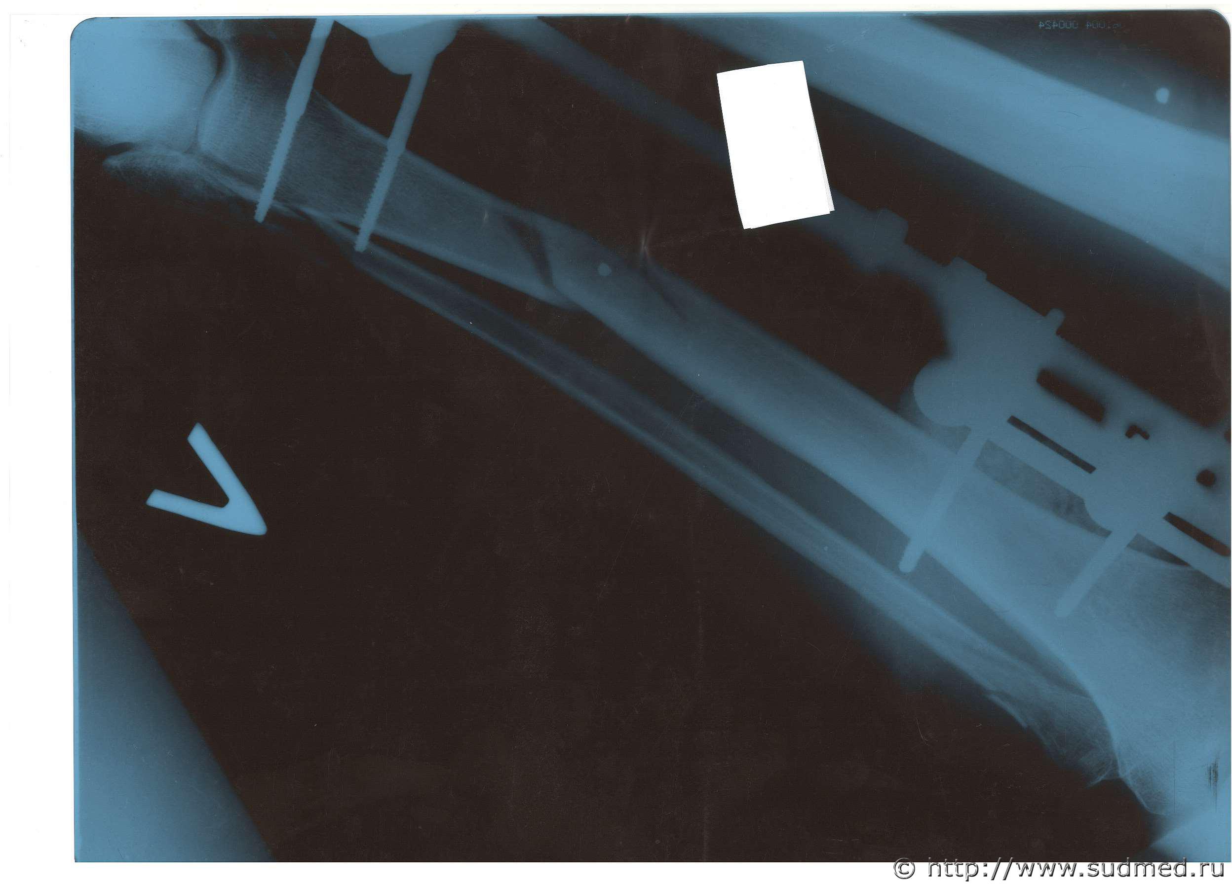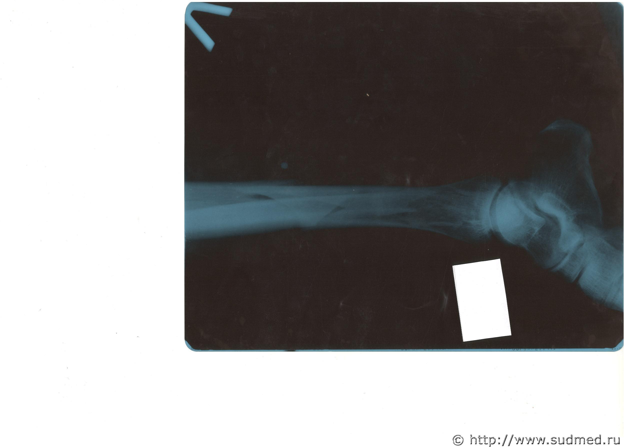 Будьте добры, посмотрите еще один снимок. Дабы развеять сомнения. Сделан сразу после оказания первой помощи в больнице. Здесь в верхнем левом углу снимка, ниже перелома основного, ближе к ступне, в месте крепления аппарата, между двумя шпильками - это не перелом? (снимок размещен в перевернутом положении). Этот снимок Ваше мнение не меняет по основному вопросу? |