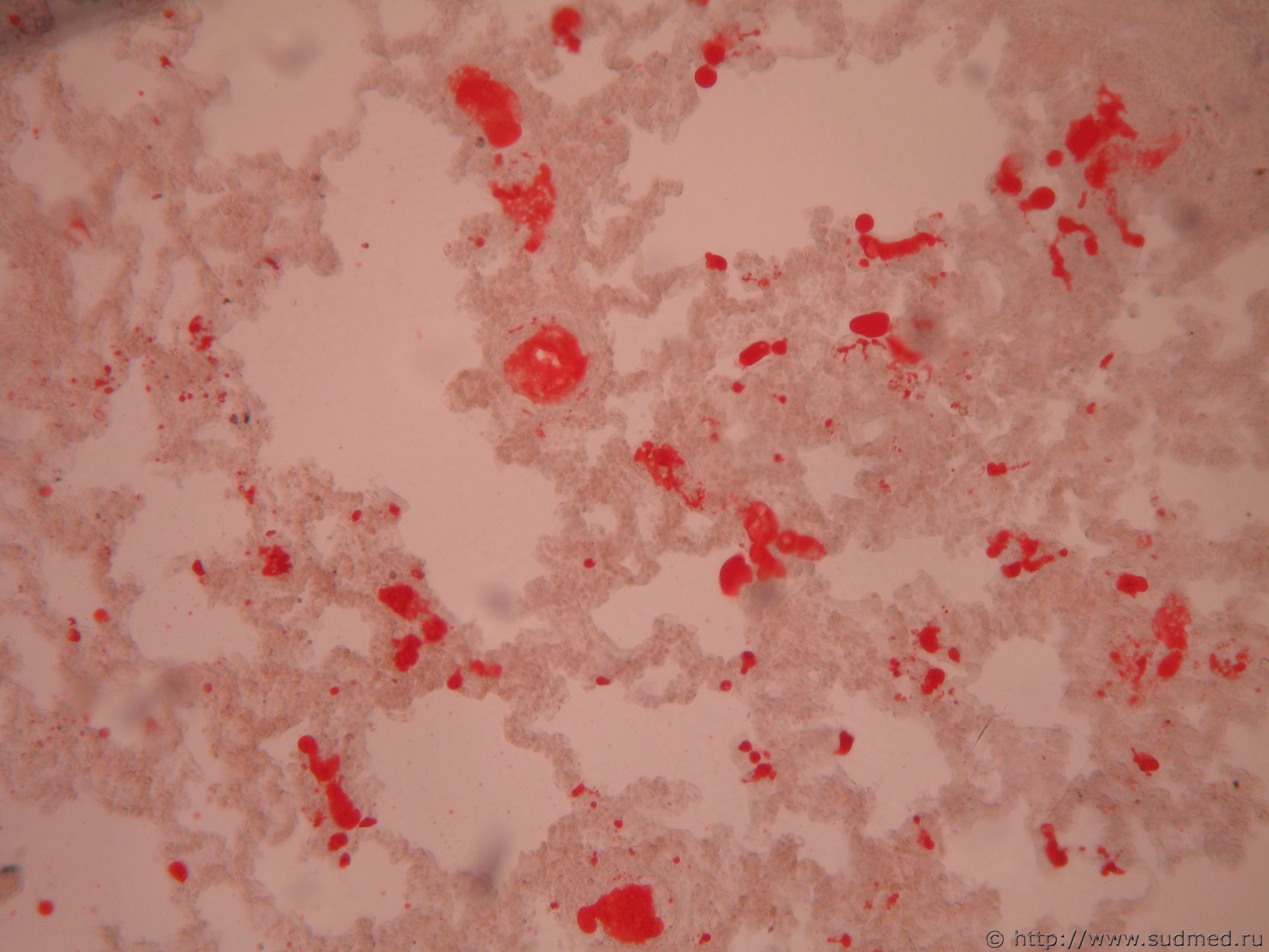а вы пишите, что "А при костной травме у детей её вообще не бывает." на фото эти же легкие, только без покрытия глицерином. объектив 10, окуляр 10. как же не бывает, а это что? Мне кажеся, это не жир. Он выглядит несколько иначе и более яркого цвета. Если увеличить фото,то видно, что эти образования не все в сосудах, они несколько зернистые. А в просвете одного сосуда (он немножко изогнут, похож на букву S) на фоне этих масс округлая пустота - м.б.каплей жира. У меня был случай, когда подобные образования я расценила как ЖЭ. Тем более что в направлении вообще кроме ФИО и возраста ничего не было указано, танатолог сразу побежал к зав.отд, божился, что причин нет для ЖЭ. Зав.вствил мне люлей и сказал, что это не жир, на мой вопрос, что же это промычал нечто членонераздельное. И еще, про некробиоз. Меня учили что его в световой микроскоп не видно. |
