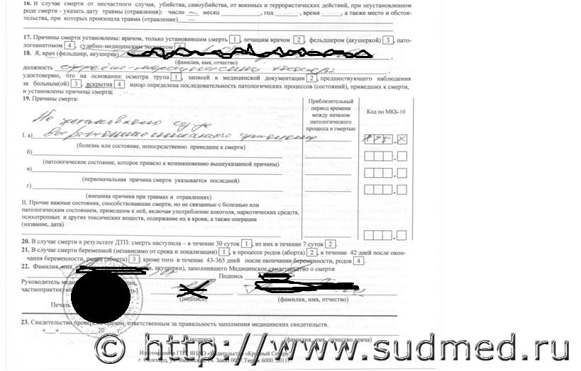 Мне представляется,что Вы на свои вопросы ответа не получите,пока не дадите нам на обозрение Акт вскрытия трупа.