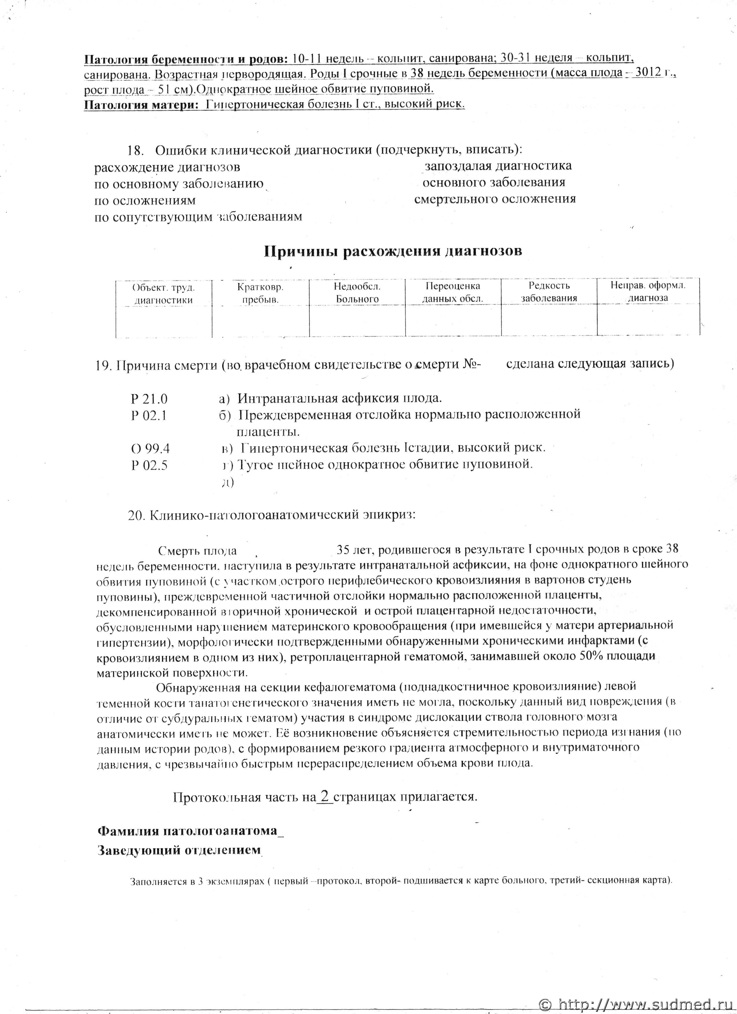 Протокол-карта не несет объективной информации для ответа на вопрос о живорожденности, проведенных реанимационных пособиях. Эта информация содержится в протоколе патологоанатомического исследования трупа, который является приложением к протоколу-карте и хранится в патологоанатомическом отделении. Получить его копию можно по решению главного врача больницы. Последний вопрос вне судебно-медицинской деятельности. Т.е. данные протокола не несут полной информации? Сделать вывод в какой момент родов остановилось сердце невозможно? И при вскрытии был только один паталогоанатам и врач принимающая роды и неонатолог присутствующая при родах. Это законно или должны быть были другие врачи? Возможно экспертами установить узлы образовались внутри или их завязали потом? Что вообще этот протокол обозначает? Такой исход можно было избежать? |