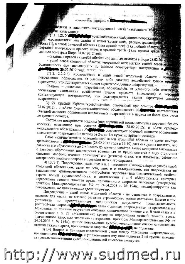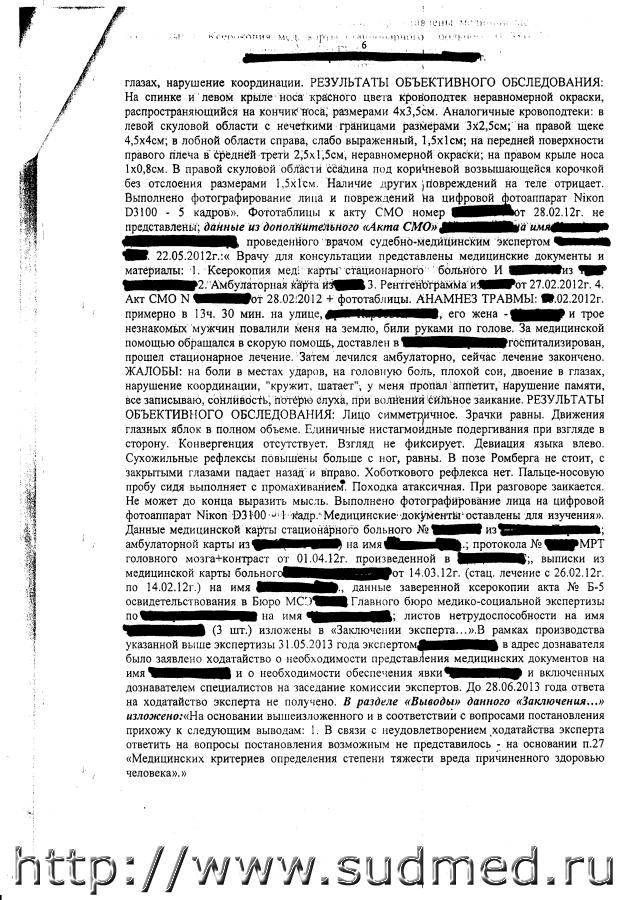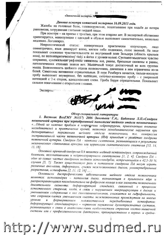 Вопрос 1-Верны ли мои доводы чтобы признать экспертизу дефектной? Вопрос 2-Какой вред здоровью по Вашему мнению? "... Ходатайство. Прошу считать «Заключение эксперта № ..... Дефектным и дать свое заключение по следующим основаниям: Юридические ошибки в оформлении: 1. Согласно ст. 27 приказа № 364H от 12.05.2010 г. Минздравсоц- развития РФ «…Заключение эксперта, включая все приложения, подписывают все принимавшие участие в производстве экспертизы эксперты - в месте разъяснения эксперту его прав, обязанностей и предупреждения об уголовной ответственности за дачу заведомо ложного заключения, в конце всей исследовательской части и в местах окончания разделов, описывающих этапы исследования конкретными экспертами в случаях проведения комиссионной и комплексной экспертизы, после выводов, в каждом приложении» - не подписаны экспертами разделы «Аналитико-синтезирующая часть» и «обзор специальной литературы». 2. Разделы «Аналитико-синтезирующая часть» и «обзор специальной литературы» обязаны входить в основной раздел «Исследовательская часть», как основные для подготовки выводов экспертов в разделе «Выводы». 3. Отсутствует, какая либо информация о дате подписания экспертами настоящего «заключения». 4. Несоответствие дат начала и окончание исследования (11.07 2013- 10.12.2013 г.) и печатью БСМЭ с фактическим окончанием исследования 25.12.2013 г. 5. Не соблюдены требования указанные в ст. 28, 29 Приказа № 364Н от 12.05.2010г. Минздравсоцразвития РФ. Дефектные медицинские исследования: 1. Проигнорированы «Медицинские критерии определения степени тяжести вреда причиненного здоровью человека» в ред. Приказа Минздравсоцразвития РФ от 18.01.2012 № 18Н с изменениями, вынесенным решением Верховного Суда РФ от 21.03.2011№ ГКПИ 11-141 в части определения вреда в связи с потерей зрения, потерей слуха, потерей речи, вестибулярных нарушений, полной утраты профессиональной трудоспособности и т.д. 2. В процессе исследования экспертом - рентгенологом .................. был поставлен диагноз «унковертебральный артроз» без дополнительных инструментальных исследований (МР ангиограмм шейного отдела, дуплексного УЗИ шейного отдела), несмотря на имеющиеся заключение и отсутствие данного диагноза в заключение рентгенолога делавшего данное исследование. В результате неподтвержденный диагноз «унковертебральный артроз», поставленный экспертом ............. лег в основу дальнейшего выставления диагноза «Синдром позвоночной артерии» (описание в разделе «аналитико-синтезирующая часть» и «обзор специальной литературы») - под которыми не стоит ни одной подписи эксперта!!!). И как следствие, непонятно кто конкретно из экспертов поставил диагноз «синдром позвоночной артерии»!!! Данный диагноз «синдром позвоночной артерии» поставлен без обязательных инструментальных исследований (МР ангограмм сосудов шеи и дуплексного УЗИ сканирования артерий шеи). Проигнорировано заключение “ Триплексного УЗИ сканирования сосудов шейного отдела”, в которых отсутствует выявленная какая-либо патология. 3. Нарушение п. 23. Приказа № 194Н (ред. от 18.01.2012 г.) от 24.04.2008 «…При производстве судебно-медицинской экспертизы в отношении живого лица, имеющего какое-либо предшествующее травме заболевание либо повреждение части тела с полностью или частично ранее утраченной функцией, учитывается только вред, причиненный здоровью че