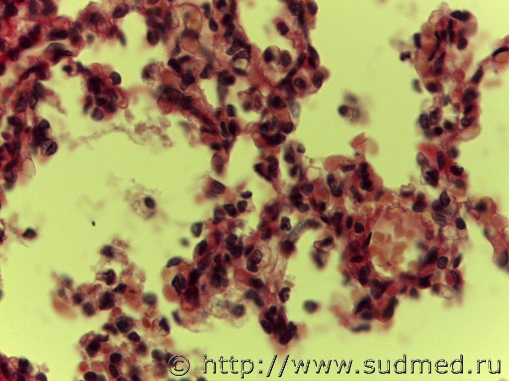 ,что ребёнок жил часы или дни. При ситуации описанной топикстартером проводятся реанимационные мероприятия. Пускай допрашивают неонатолога.Уверен,что он даст положительный ответ на вопрос о проведении искусственной вентиляции лёгких. Ув.медик! По одному признаку утвердительный вывод сделать нельзя, все это предварительное мнение. Однако я не вижу массивной аспирации ЭОВ по присланным объектам ткани легких. А на фоне внутриутробной гипоксии во время родов если головка ребенка вышла , любой ослабленный ребенок при контакте с внеутробной средой, т.е. атмосферой, хоть в считанные минуты если даже не полностью, но вдохнуть воздуха при первом же слабом вдохе сможет. А наличие кровоизлияния свежего в просвете альвеол указывает о прижизненности явления и является одним из синдромов РДСН, раньше называли пневмопатиями. Что такое аспирация ЭОВ у мертворожденного плода в архиве у меня есть, микрофото если найду отправлю. |
