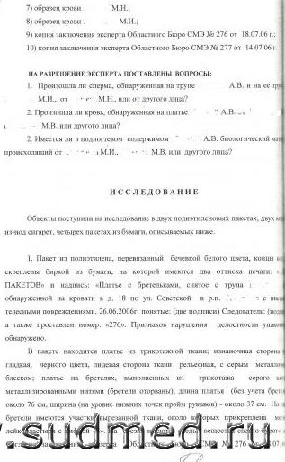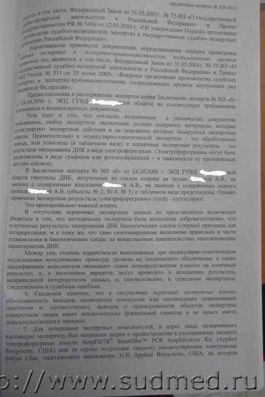 А семь лет назад , нам не дали провести повторную экспертизу ( просили неоднократно ) , не дали вызвать специалиста , семь лет мы просим проверить нарушения по экспертизе , и только сейчас добились , но увы оказалось , что фореграмм уже нет .Последние выложенные страницы из заключения ФГУ РЦСМЭ . Нарушения в экспертизе , такие , которые вижу я ( если не так , то напишите как надо )- 1.ст.204 УПК ( нет фореграмм) , также другие НПА . 2. Эксперту в постановлении ставятся одни вопросы , а отвечает на другие , то есть сам себе добавляет , при этом нет каких либо ходатайств от эксперта , соответственно сам себе добавляет материал для исследования . 3. Многие предоставленные материалы не опечатанные - ни каких актов или заявлений от эксперта .4.эксперт отвечает на вопрос по крови , что не смогла установить генотип из за недостатка материала - на суде говорит , что кровь не исследовала . Как Вы считаете это не основания сомневаться ? Не дали провести экспертизу или не было правовых оснований? Мотивировки с которыми Вам отказывали пожалуйста? другие НПА, это какие? Эксперт в праве экспертной иницативе может отразить ответы на вопросы которые не поставлены, это не просто нормально, это очень даже хорошо. Не дали провести экспертизу или не было правовых оснований? Мотивировки с которыми Вам отказывали пожалуйста? другие НПА, это какие? Эксперт в праве экспертной иницативе может отразить ответы на вопросы которые не поставлены, это не просто нормально, это очень даже хорошо. На счет неотпечатанных материалов вообще не поняла поток мысли |