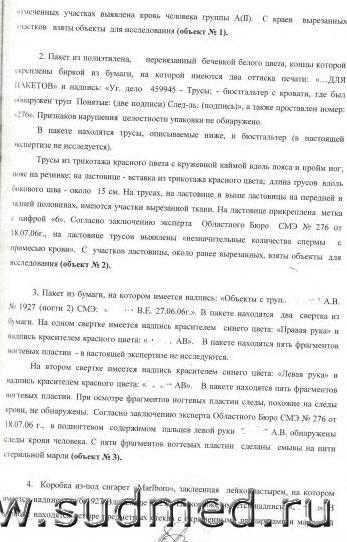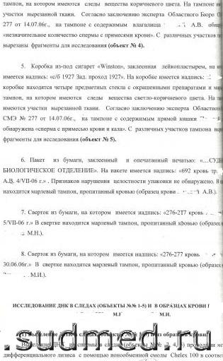 [/i] [i]первое утверждение выглядит правдоподобно, исходя из описанного в заключении За чем тогда на суде говорить , что кровь не исследовала ? [/i] [i]Но почему Вы считаете что 7 лет назад их не было? Просто уничтожили по истечении срока. В 2011 году , когда экспертизе не было ещё 5 лет , я обращалась к эксперту по поводу фореграмм , она сказала , что фореграммы остались не все , то есть по вещ.докам нет , а по подозреваемому промежуточные , получается , что у неёё всё хранилось в разных местах , а не в одном месте или деле ? Ни кто их никогда не требовал и не видел . [/i] [i]Нет, здесь Вы не правы, эксперт ответила на все вопросы на которые была возможность ответить. С материалом который был собран под ногтями жертвы реакция не прошла, возможно из-за проблем с концентрацией днк. В постановлении нет вопроса о подногтевом содержимом , соответственно на исследование ей тоже это не передовалось . |