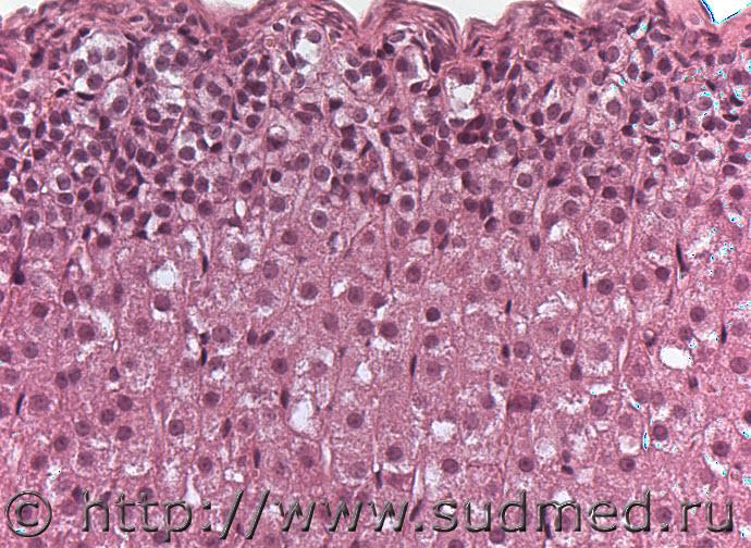 Животные в нашей лаборатории живут в комфортных условиях, т.е. в комнатах содержания животных поддерживается определенный температурный режим, давление и влажность. Это линейные животные, которые выращивают в питомниках специально для проведения доклинических исследований. Представленную морфологическую картину я часто наблюдаю и у интактных животных. Единственным стрессом, который они могут испытывать - это эвтаназия в камере с углекислым газом, но этот момент проходит быстро. Возможно, этот фактор может явиться причиной развития представленной морфологической картины, если иметь в виду эозинофильные локусы, но с моей точки зрения это некробиоз, т.е. явление обратимое. Что касается светлых клеток, то это не гидропическая дистрофия, а светлоклеточная трансформация, связанная с повышенной секреторной активностью клеток, вырабатывающих стероиды, которые являются соединения липидной природы. В процессе проводки жироподобные вещества "вымываются" из клеток и клетка выглядит "пустой". |