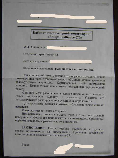 Здравствуйте! Меня сбил автомобиль. Бригада скорой помощи доставила меня в стационар с диагнозом - сотрясение мозга, ушиб грудного отдела позвоночника, компрессионный перелом грудного отдела позвоночника. При поступлении в стационар мне было сделано несколько рентгеновских снимков и поставлен диагноз - компрессионный перелом 4 грудного позвонка. Из-за "мутных" рентгеновских снимков через 9 дней мне сделали КТ и диагноз сняли на основании этого заключения.