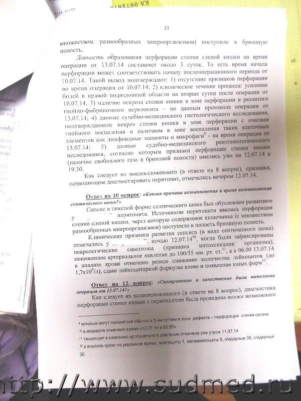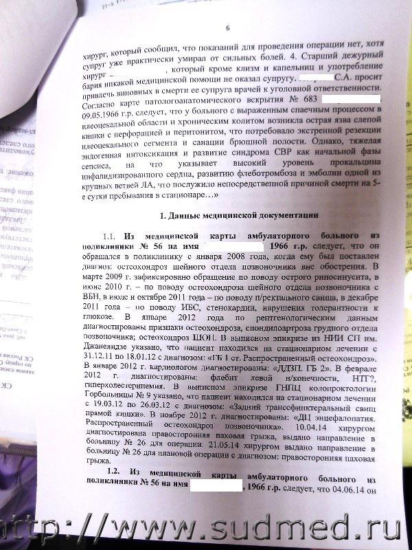 У меня умер муж в больнице (48 лет) после плановой операции от септического шока в результате перфорации стенки слепой кишки и развития перитонита . Повторную операцию сделали поздно. Следователь назначила судебно-медицинскую экспертизу. Экспертиза выявила, что диагностика была несвоевременной и повторная операция - запоздалой. Сама операция- ненужной. При этом экспертиза делает вывод делает вывод о непрямой причинно-следственной связи между дефектами оказания помощи и смертью. Следователь напишет отказ в возбуждении уголовного дела. Что можно сделать в этой ситуации, как наказать врачей за смерь мужа? У нас трое детей, двое маленьких. Помогите, пожалуйста. Прикрепляю экспертизу (15 страниц, 10 в следующем сообщении). Спасибо ____________ |