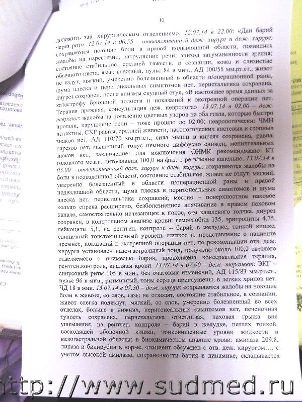 Как это не сообщат ? Результат проверки Вы должны знать. Обращались ли Вы за юридической помощью к адвокату ? За юридической помощью к адвокату не обращалась. Думала, будет уголовное дело (статья 293 УК халатность) Уважаемый Медик! Мне непонятно, почему вывод СМЭ - о непрямой причинно-следственной связи между дефектами оказания медицинской помощи и смертью? Если бы перитонит (а первые признаки перитонита- свободный газ в брюшной полости, сильные боли, потеря сознания наблюдались уже вечером 12.07, пуль 100, низкое давление), был прооперирован немедленно, шансы были бы наверное 90%-100%, а не 10%. Мне заведующая реанимации 14.07. сказала, что вашего мужа проср..ли. Вот так, одним словом. Что делал рентгенолог, деж.хирург, отв. деж.хирург целый вечер и целую ночь до следующей смены? они что, не слышали про перитонит ничего, никогда не сталкивались? такой версии даже выдвинуто не было. Я постоянно на пост ходила, и слушала, что они говорят, и спрашивала, что это? какой план ? но я же не медик. Когда мужу сделали повторную операцию 13.07, и хирург мне сказал про разлитой гнойный перитонит, я много в интернете вечером прочитала, у мужа все признаки были, а лейкоциты низкие в 6 утра? 1,7? я видела этот анализ, все анализы приходилось буквально вытаскивать, чтобы за ними сходили на другой этаж, я же спрашивала у деж.хирурга, почему такие низкие лейкоциты? Он сказал, наверное от капельниц. Это о какой квалификации врача говорит? Халатность этих врачей стоило моему мужу жизни. Я не понимаю, почему связь непрямая. Как это, запоздала операция не прервала (не ослабила) течение начавшегося патологического процесса? |