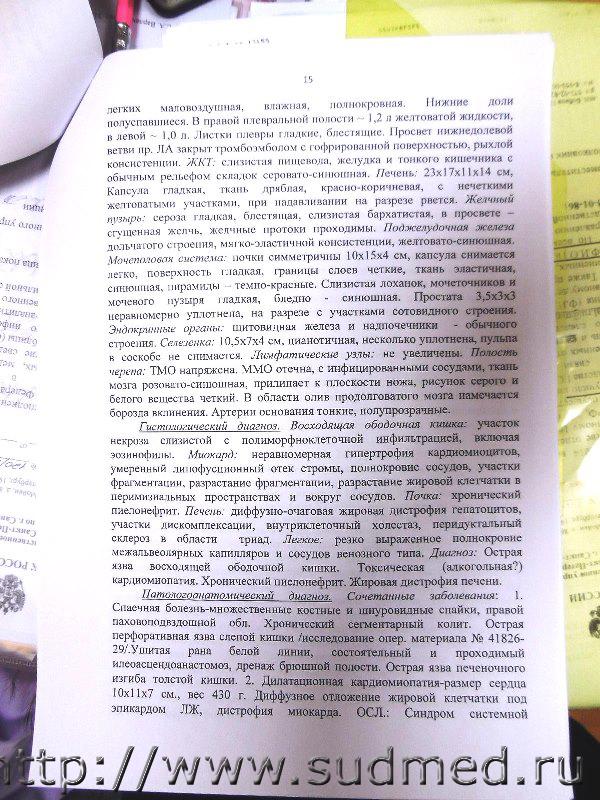 Не понял,что было в легочной артерии (тромб или свёрток крови),описан как тромб,но не взят на гистологическое подтверждение и если тромб,то это тромбоэмболия или тромбоз? О каком флеботромбозе идёт речь?Не нашёл ничего про тромбированные вены.В патологоанатомическом протоколе не описаны область оперативного вмешательства,состояние кишечного анастомоза,брюшина и содержимое бр.полости.Дилатационной кардиомиопатия очень и очень сомнительна.Можно даже написать,что её нет.Про острую язву печёночного изгиба толстой кишки ничего не нашёл.Откуда она взялась в диагнозе? В ответе на 13 вопрос."Множество разнообразных микроорганизмов" - улыбнуло.Откуда комиссия это взяла? Не нашёл результаты бактериологического исследования содержимого брюшной полости и крови больного. При патологоанатомическом исследовании не взят материал на бактериологию. Септический шок обоснован только клинически и без результата бактериологического исследования крови. Макроскопически и гистологически не вижу изменений подтверждающих "септический шок". Комиссия далека от понятия "Основная причина смерти" и "Непосредственная причина смерти". Преимущественно учитывая клинические данные можно написать,что Ваш супруг страдал спаечной болезнью (код К66.0 МКБ-10),вероятно,в результате ущемления между спайками участка слепой кишки произошли некроз и перфорация стенки этой кишки с последующими разлитым перитонитом и,наверное,септическим шоком. Таким образом,основная (первоначальная) причина смерти это спаечная болезнь,перфорация слепой кишки-патологическое состояние,которое привело к непосредственной причине смерти,а сама непосредственная причина смерти - это перитонит.Если размышлять о септическом шоке - да, он наверное, и мог здесь быть непосредственной причиной смерти,но он, как я писал выше,морфологически не подтверждён.Да и перитонит не имеет морфологического подтверждения. |