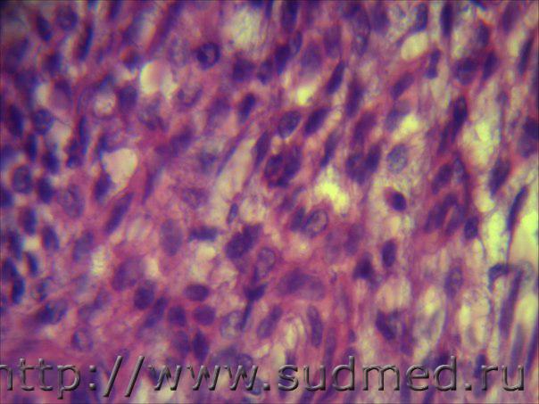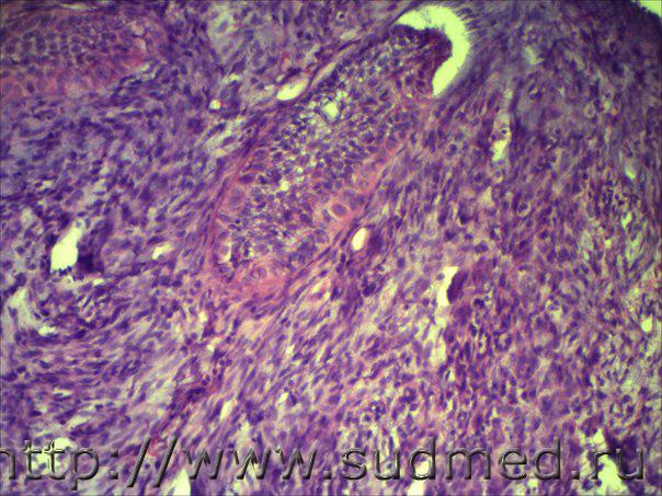 Н/О в ротовой полости в области десны По многослойным плосколеточным эпителиям слизистой имеет место базальноклеточная нарушение полярности( умеренные признаки дисплазии), а по подслизистой строме признаки если это действительно макроопухоль, то микроскопически веретеноклеточный(фиброзный) эпулис! |