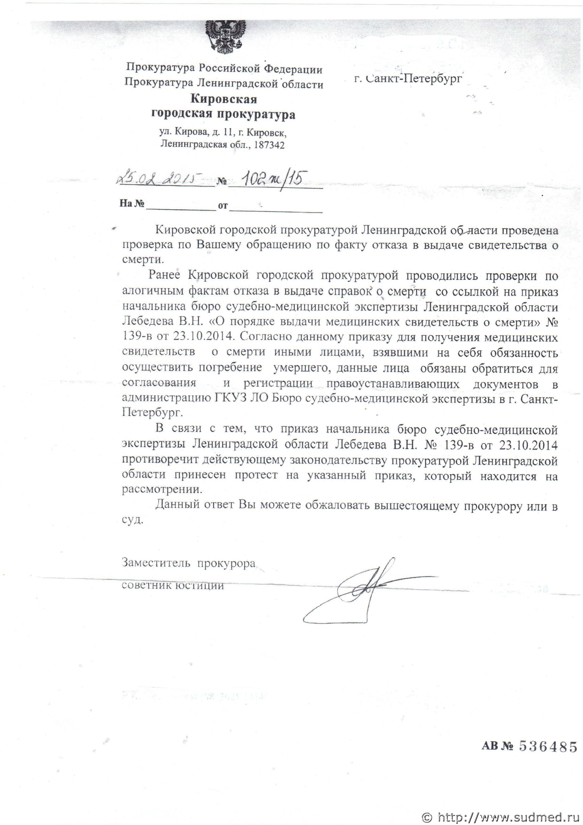 "...В прокуратуру Кировского района Лен.области 16 января поступила жалоба от ритуальной конторы на незаконный отказ в выдаче справки о смерти в местном морге..."