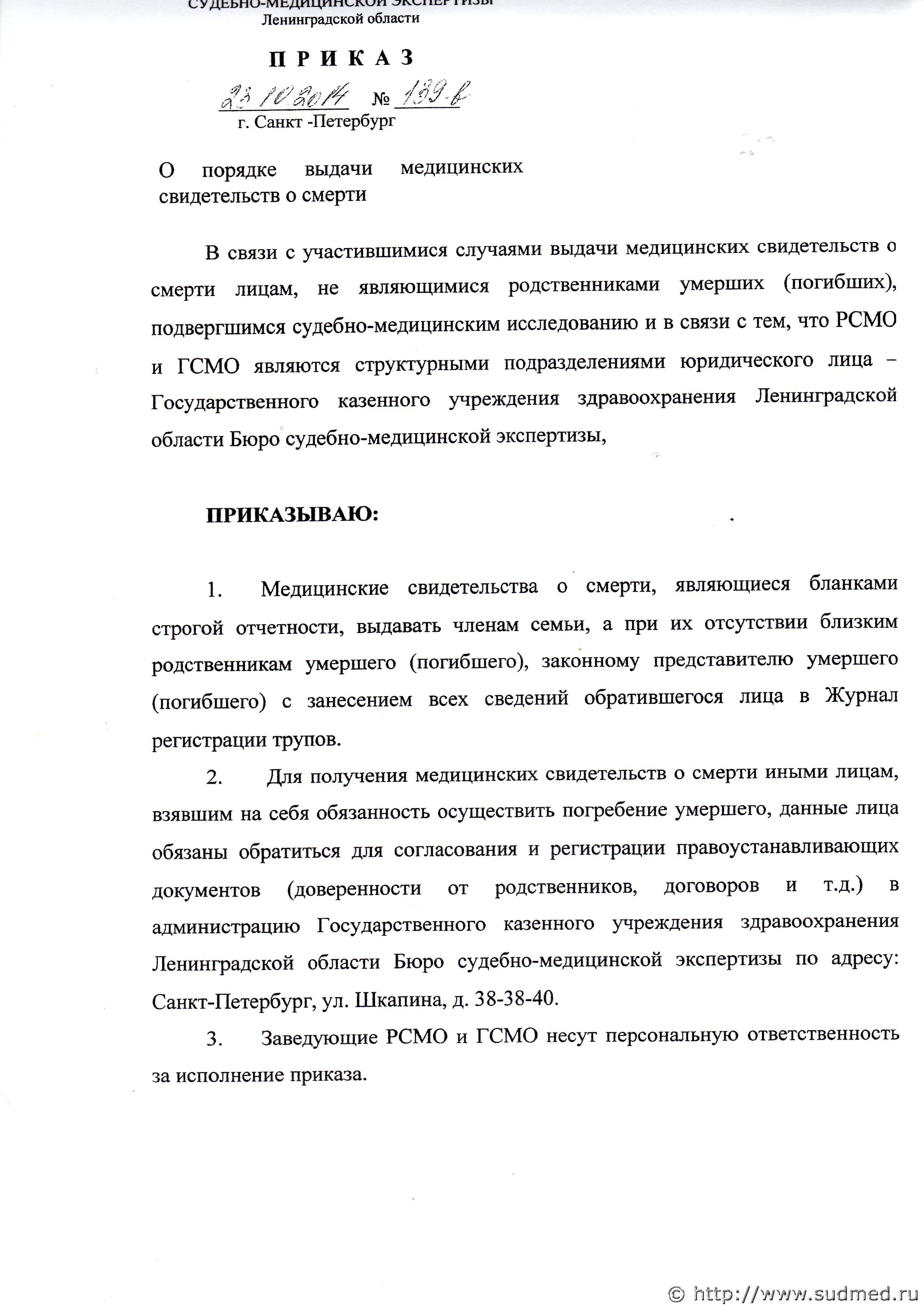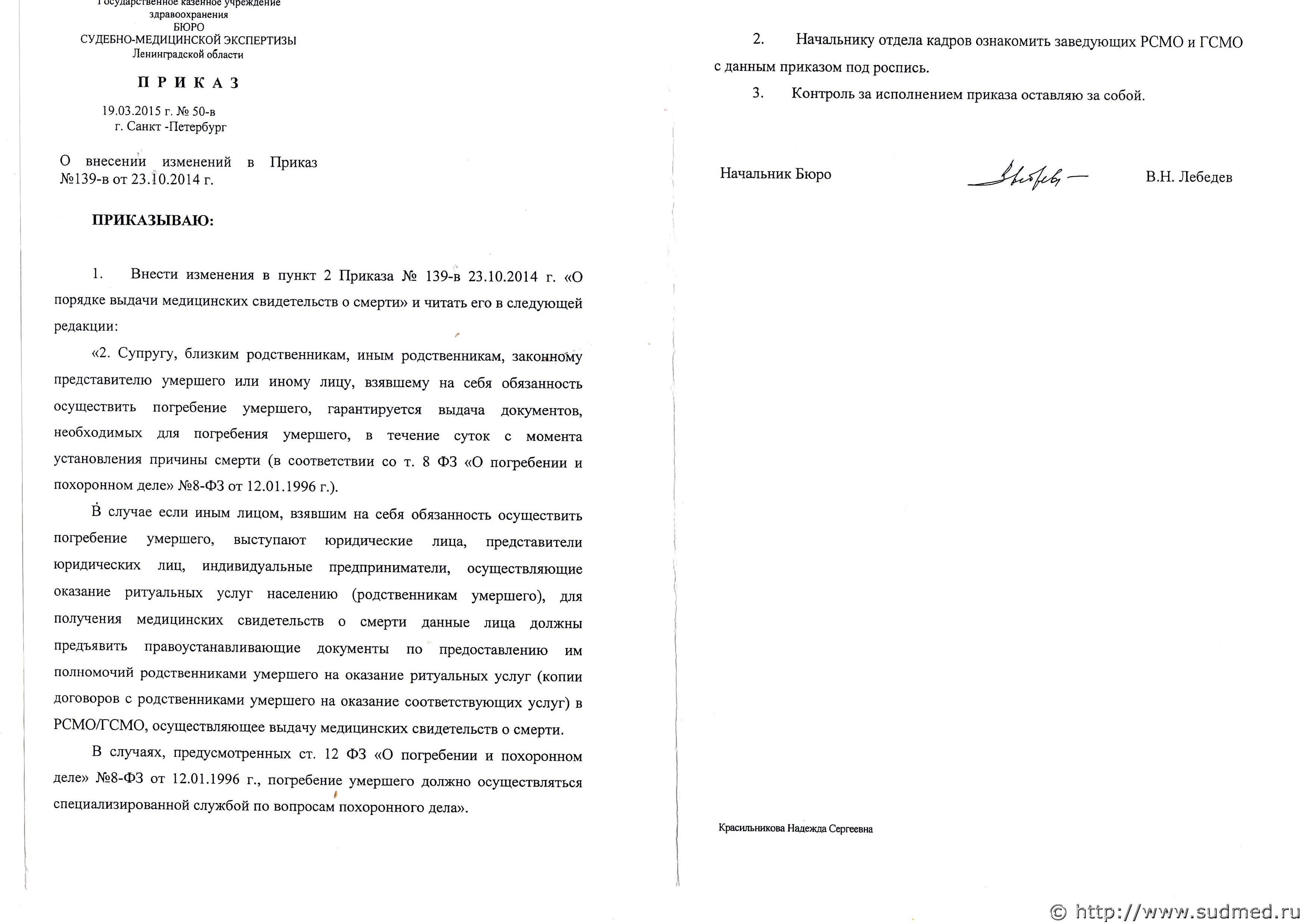 "... приказ, датированный мартом 2014 года, запрещает отправлять умершего гражданина куда-либо кроме как в морг по месту смерти..." Статья в прессе: Видеосюжет на НТВ: |