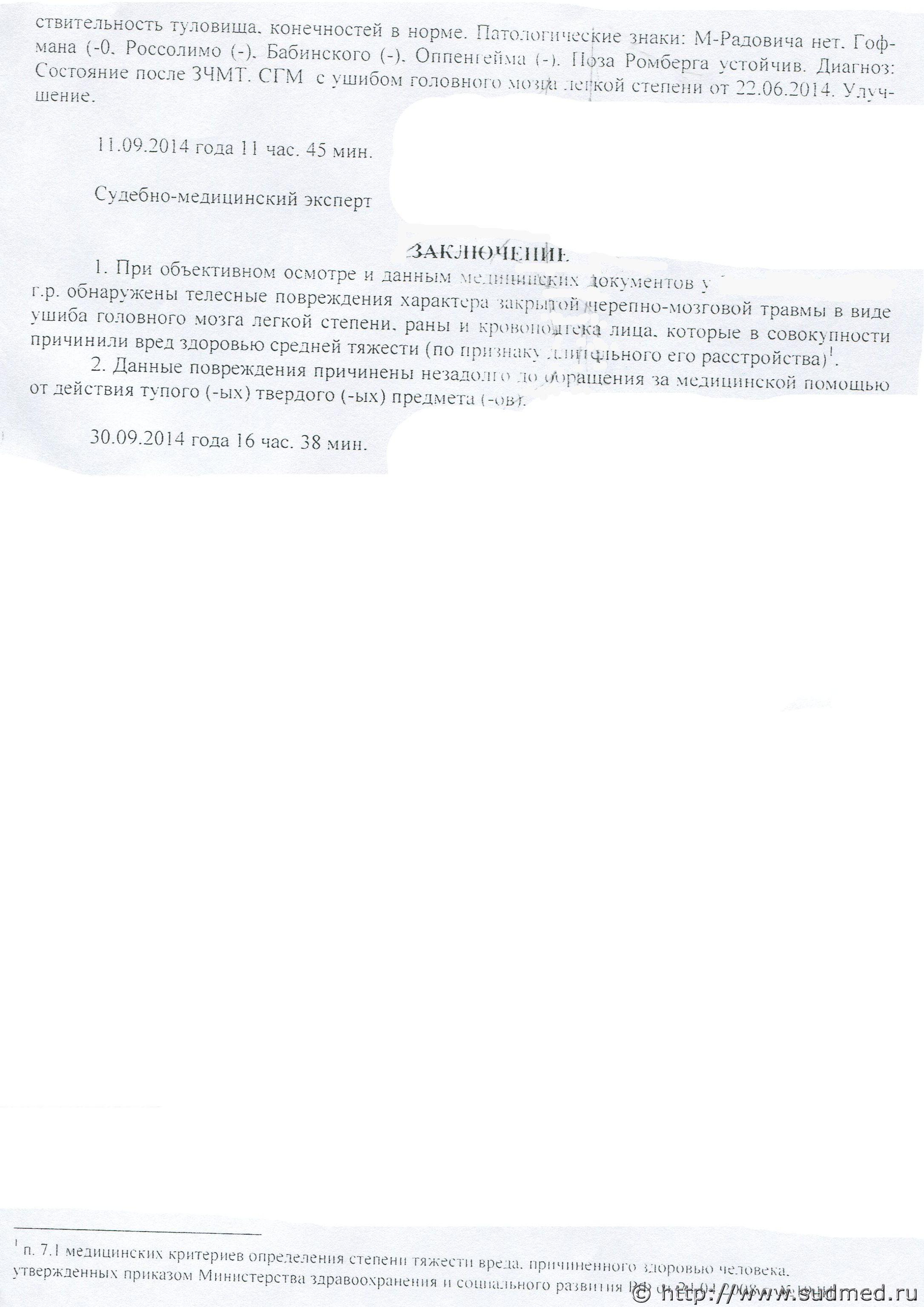 Достоверных объективных данных за ушиб головного мозга легкой степени не отмечено: нет очаговой симптоматики и т.д. Клиническая картина более характерна для сотрясения головного мозга. На фоне внутричерепной гипертензии (хроническая патология). При экспертизе не исследовано состояние здоровья до предъявляемой травмы, при том, что на экспертизу была представлена амбулаторная карта с данными, начиная с 28.10.13г. Это может оказаться важным! Имеет смысл ходатайствовать о назначении повторной суд-мед.экспертизы - комиссионной, с включением в состав экспертной комиссии эксперта-невролога. По результатам повторной экспертизы, больше вреда средней тяжести не будет, возможно - будет установлен легкий вред здоровью. Точно сейчас определить невозможно. Посоветуйтесь с адвокатом по поводу необходимых правовых действий для повторного исследования. Впредь не занимайтесь подобной ерундой: произвольно выдернутые Вами из контекста кусочки информации способны привести к нашему ошибочному суждению и, соответственно, к Вашим дополнительным проблемам. Спасибо Радомир, что откликнулись! Сделал так потому, что не хотел, чтобы заключение Вас наводило на неверный путь! Вы подтвердили очевидное. Я конечно не эксперт, но проанализировав массу нормативных актов и монаграфий (в том числе по СГМ) пришел к выводу, что и легкий вред в данном конкретном случае с натяжкой, так как диагноз построен больше на субъективных данных, чем на объективных. |