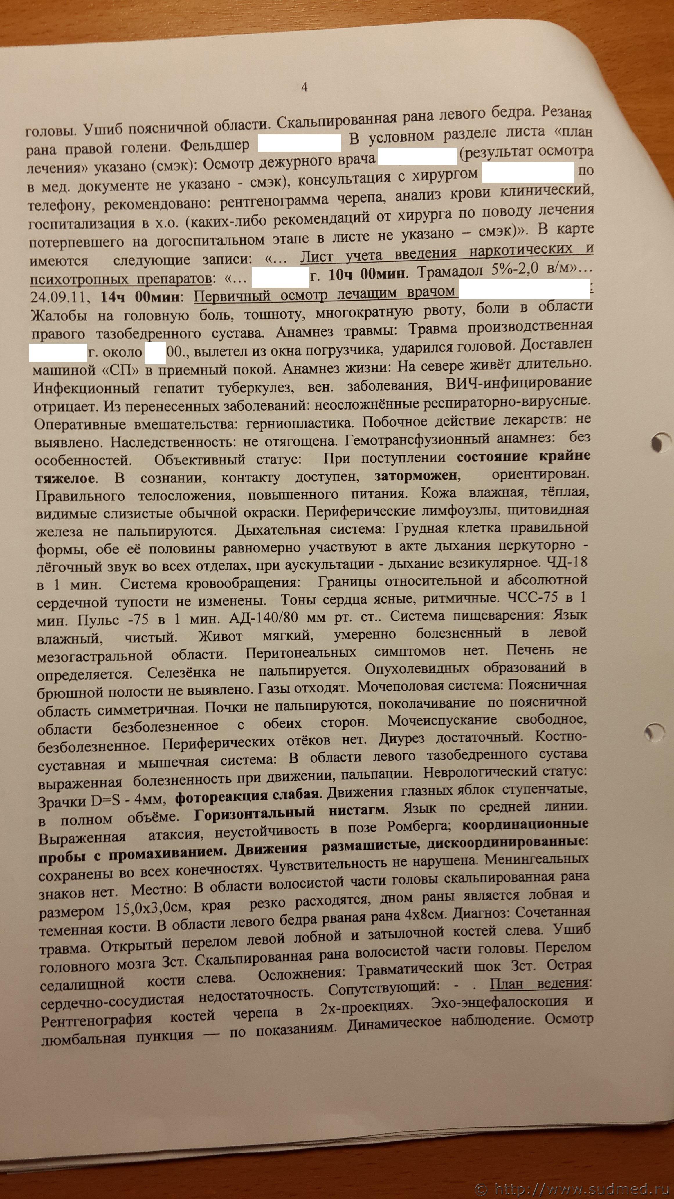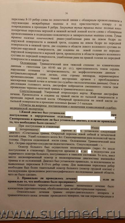 Уважаемые участники форума, судебно-медицинские эксперты! Необходима Ваша консультативная помощь в отношении оценки комиссионной СМЭ по материалам уголовного дела, возбужденного по статье 109 ч.2 УК РФ в отношении врача хирурга. Общий смысл в том, что пациент получивший производственную травму, выпавший из окна погрузчика с 6 метровой высоты и ударившийся головой о металлический ковш, поступает в лечебное учреждение, где ему оказывается медицинская помощь, в том числе и первичная хирургическая обработка раны головы. Больной умирает через 13, 5 часов после поступления в лечебное учреждение. Государственный судебно-медицинский эксперт производивший вскрытие трупа, и дававший заключение в том числе и на основании судебно-гистологического заключения и оценки медицинской документации, указывает, что смерть наступила от сочетанной тупой травмы головы с переломом костей свода и основания черепа, сопровождавшейся отеком и дислокацией головного мозга. Он же квалифицирует указанные повреждения, как ТЯЖКИЙ вред здоровью по признаку опасного для жизни, который "стоит в прямой причинной связи с наступлением смерти потерпевшего".