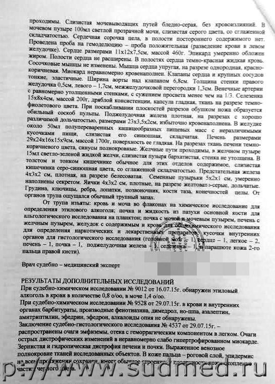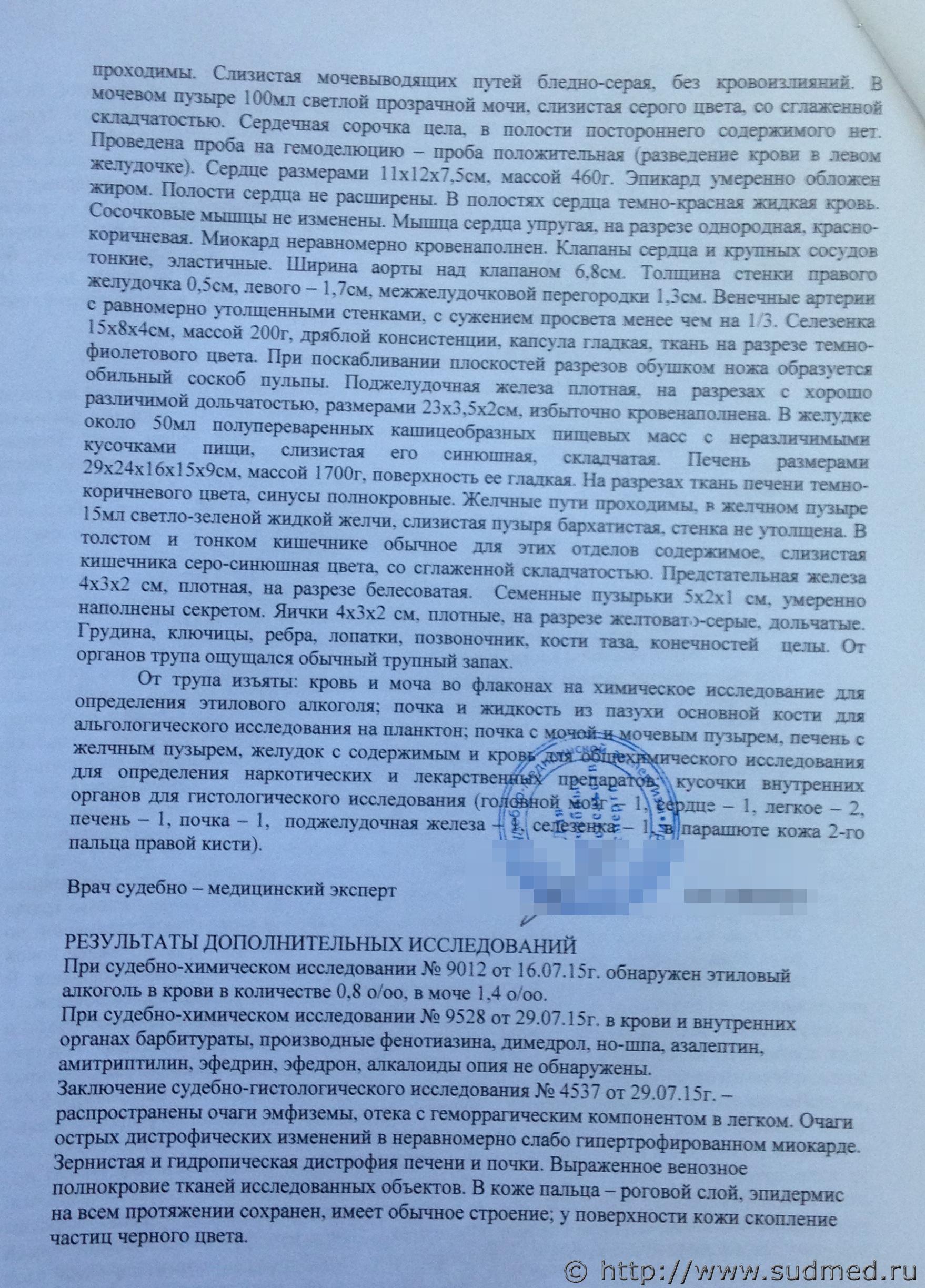 Это всё что удалось сфотографировать из заключения СМЭ. Плохо. Нужны др.страницы и гистологический Акт. повторная экспертиза ничего не покажет? Как ответить на Ваш вопрос,если Вы предоставили лишь половину Акта судебно-медицинского исследования трупа ? Да ещё не хватает и полного гистологического Акта. Вы не даёте необходимой информации для ответа на Ваш вопрос. Пока тему закрыл. Когда у Вас будут все документы,обратитесь к любому модератору и тему откроют. |