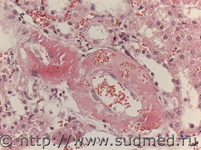 На фоне геморрагического шока в некоторых сосудах почки наблюдался некроз мышечной оболочки небольших артерий с признаками плазморрагий и геморрагий, - это мое мнение. Относительно геморрагий мнения разделись, и коллега-гистолог высказала мнение о наличие в поврежденной оболочке сосудов сосуда. Хотелось бы узнать мнение других специалистов-гистологов по этому вопросу.
