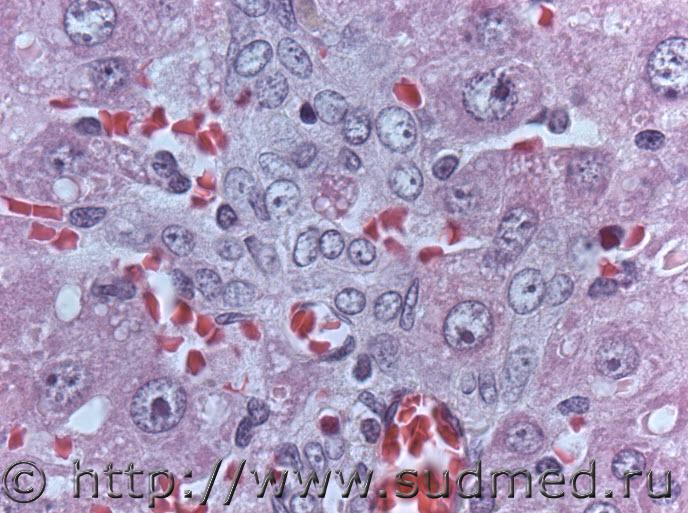 Термины медцинские и биологические требуют критерии определенного применения. Согласна с Вами, уважаемый Доктор морфолог, относительно того, что медицинские термины следует использовать корректно. Цитата(доктор морфолог) Высокая пролиферативность клеток более близко при опухолевых процессах. Однако, хотелось бы узнать Ваше мнение относительно того, какой термин вместо "пролиферация" следует употребить в случае репаративной регенерации гепатоцитов на фоне их гибели, которая наблюдалась после введения тестируемого препарата (ув.х200, х400 и х1000). А также, как корректно охарактеризовать процесс "пролиферации" эпителия желчных протоков, представленный на последней фотографии (ув.х1000). Эскизы прикрепленных изображений |