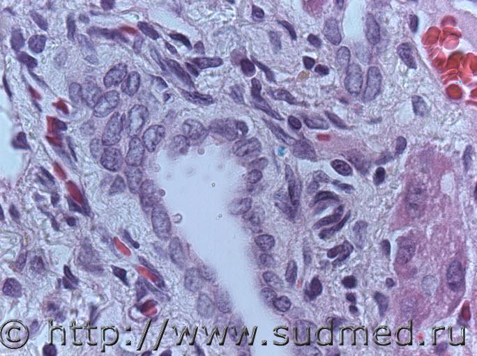 Если подопытный животное жил еще пару часов, то наверняка увидели бы периваскулярного(стромального)кровоизлияния. В данном эксперименте после ряда процедур, включающих введение тестируемого препарата, клинические проявления геморрагического шока постепенно прошли и некропсия осуществлялась на 4-й день. Это как раз тот срок, когда у мелких грызунов начинают активизироваться пролиферативные процессы. По литературным данным пик пролиферации приходится на 7- сутки. Цитата(доктор морфолог) Согласен, что в данном сосуде не сосуды сосудов и не вновь образуюшийся капилляры, а некроз при нарушении кровообращения наступает быстрее, а для развития новых капилляров нужно время. Изначально я была склонна полагать, что на микрофотографиях имеет место картина некроза мышечной оболочки с плазмо- и геморрагиями. Сейчас на основании Вашего мнения относительно наличия фенестров, на что, кстати, тоже обратила внимание коллега-гистолог, я более придерживаюсь мнения в пользу ангиогенеза. Вероятно, поврежденная стенка сосуда в дальнейшем восстановится, естественно, деформации будут присутствовать. Понимаю, что об этом можно только догадываться. |