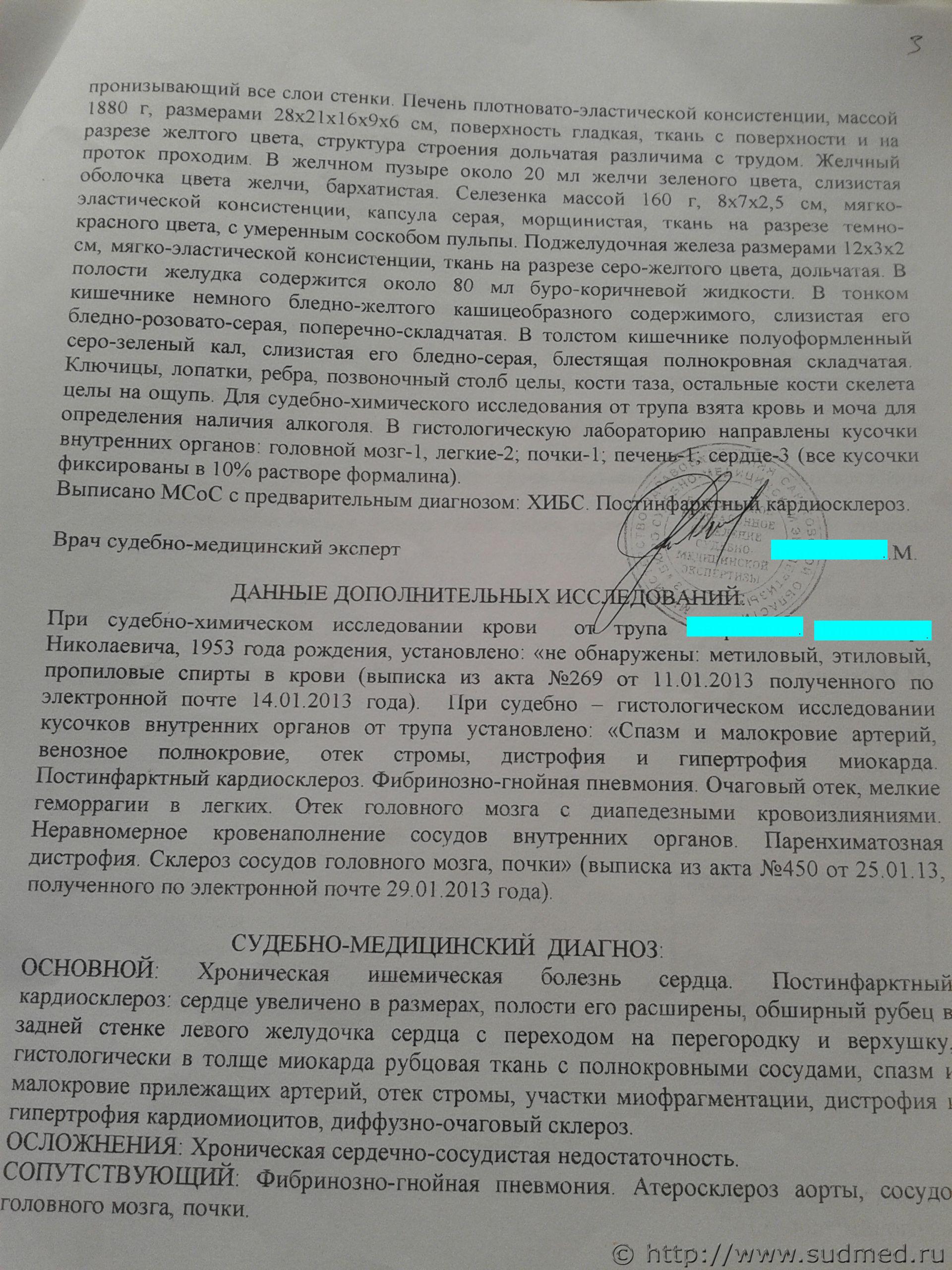 В "Акте медицинского исследования трупа" написано: "плотный белесый рубец сердце, размером 4х6 см", а в "Справке о смерти" моего отца указана причина смерти - "постинфарктный кардиосклероз". в 2012 году папа за 4 месяца до смерти попал в ДТП, были переломы грудной клетки, а за 1,5 месяца до его смерти он пожаловался на сильную боль в груди. Отец три года до момента смерти стоял на ДУ у терапевта с диагнозом ИБС и ГБ, но до ДТП у папы не было инфарктов и таких сильных болей в груди, то есть сильные болевые ощущения в груди были дважды: в период ДТП и за полтора месяца до смерти. Ранее многочисленные ЭКГ и УЗИ через три недели после ДТП не показывали ИМ и рубец на сердце. И ЭКГ, сделанное за полтора месяца до папиной смерти их тоже не показала. Может быть, потому что рубец на задней стенке сердца? В связи с этим интересуют вопросы: 1. Какой срок образования "плотного белесого рубца на сердце, размером 4х6 см". 2. В какой из двух описанных мной болевых периодов у папы наиболее вероятно было возникновение инфаркта? 3. Столкновение при ДТП и переломы могли повлиять на сердце и можно ли в этом случае не заметить ИМ? Спасибо. |