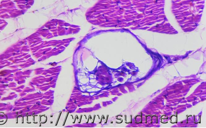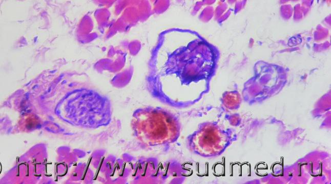 Первое впечатление после просмотра было о паразитарном происхождении. Второе- миозит (кроме данных образований, имеется очаговая инфильтрация в основном лимфоцитарная). Но причина? Консультировались с паразитологами и ветеринарами ... к единому мнению не пришли. |