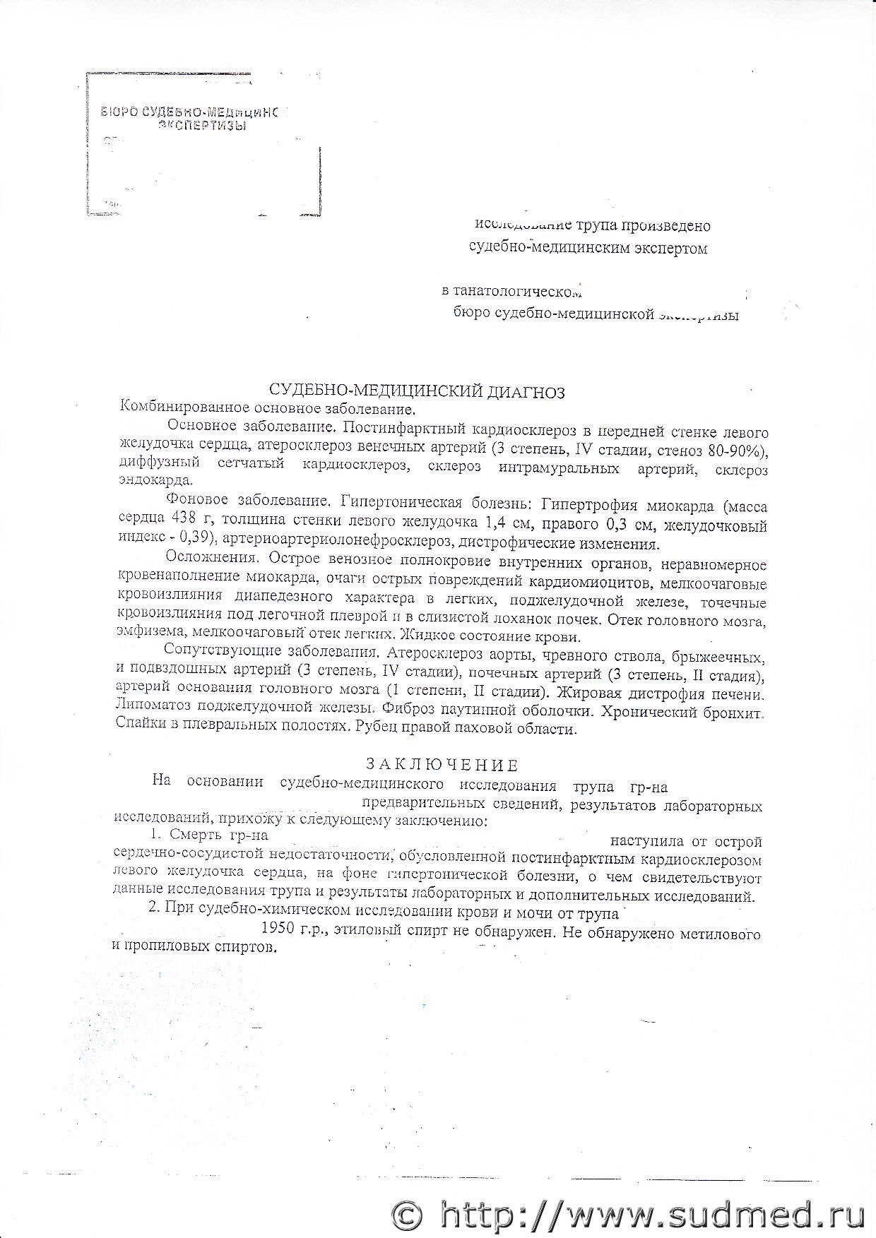 "Выписка из акта.... судебно - медицинского исследования трупа имя фам.отчество 10ю02.1950 года рождения исследование произведено судебно-медицинским экспертом (фамилия) в танатологическом отделении бюро судебно-медицинской экспертизы СУДЕБНО-МЕДИЦИНСКИЙ ДИАГНОЗ Комбинированное основное заболевание Основное заболевание. Постинфарктный кардиосклероз в первой стенке левого желудочка сердца, атеросклероз венечных артерий (3 степень, 4 стадии, стеноз 80-90%), диффузный сетчатый кардиосклероз, склероз интрамуральных артерий, склероз эндокарда. Фоновое заболевание. Гипертоническая болезнь: Гипертрофия миокарда (масса сердца 438 г, толщина стенки левого желудочка 1,4 см, правого 0,3 см, желудочковый индекс - 0,39), артериоартериолонефросклероз, дистрофические изменения. Осложнения. Острое венозное полнокровие внутренних органов, неравномерное кровенаполнение миокарда, очаги острых повреждений кардиомиоцитов, мелкоочаговые кровоизлияния диапедезного характера в легких, поджелудочной железе, точечные кровоизлияния под легочной плеврой и в слизистой лоханок почек. Отек головного мозга, эмфизема, мелкоочаговый отек легких. Жидкое состояние крови. Сопутствующие заболевания. Атеросклероз аорты, чревного ствола, брыжеечных, и подвздошных артерий (3 степень, 4 стадии), почечных артерий (3 степень, 2 стадия) , артерий основания головного мозга ( 1 степени, 2 стадии). Жировая дистрофия печени. Липоматоз поджелудочной железы. Фиброз паутинной оболочки. Хронический бронхит. Спайки в плевральных полостях. Рубец правой паховой области. ЗАКЛЮЧЕНИЕ На основании судебно-медицинского исследования трупа г-на (имя фамилия отчество), предварительных сведений, результатов лабораторных исследований, прихожу к следующему заключению: 1. Смерть гр-на (имя фамилия отчество) наступила от острой сердечно-сосудистой недостаточности, обусловленной постинфарктным кардиосклерозом левого желудочка сердца, на фоне гипертонической болезни, о чем свидетельствуют данные исследования трупа и результаты лабораторных и дополнительных исследований. 2. При судебно-химической исследовании крови и мочи от трупа (имя фамилия отчество), 10.02.1950 г.р., этиловый спирт не обнаружен. Не обнаружено метилового и пропиловых спиртов. выписку подготовил врач судебно-медицинский эксперт....." |