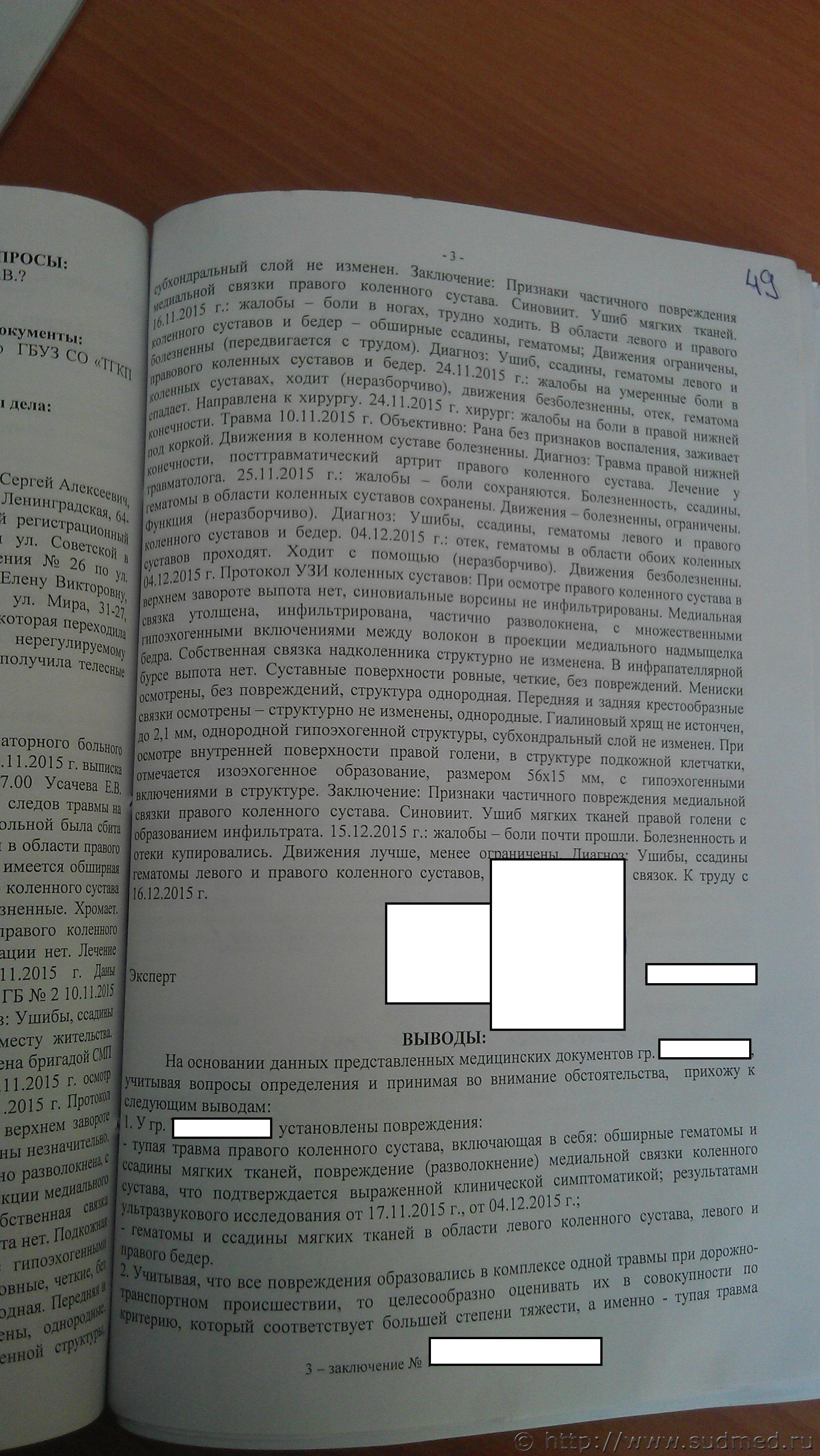 Посмотрел представленное Вами заключение эксперта. Выводы верные: вред здоровью средней тяжести. Травма была 10.11. Клиническая симптоматика травмы области правого коленного сустава зафиксирована при первичном осмотре, непротиворечиво отмечалась при дальнейшем наблюдении. В т.ч. описывалось нарушение функции (хромота, движения ограничены в т.ч. на 15.12) При УЗИ от 17.11. и 04.12. - признаки частичного (неполного) повреждения медиальной (внутренней боковой) связки правого коленного сустава в виде её отека (утолщения), инфильтрации, разволокнения. Признаков нетравматической патологии связочного аппарата сустава, его менисков не выявлено.
