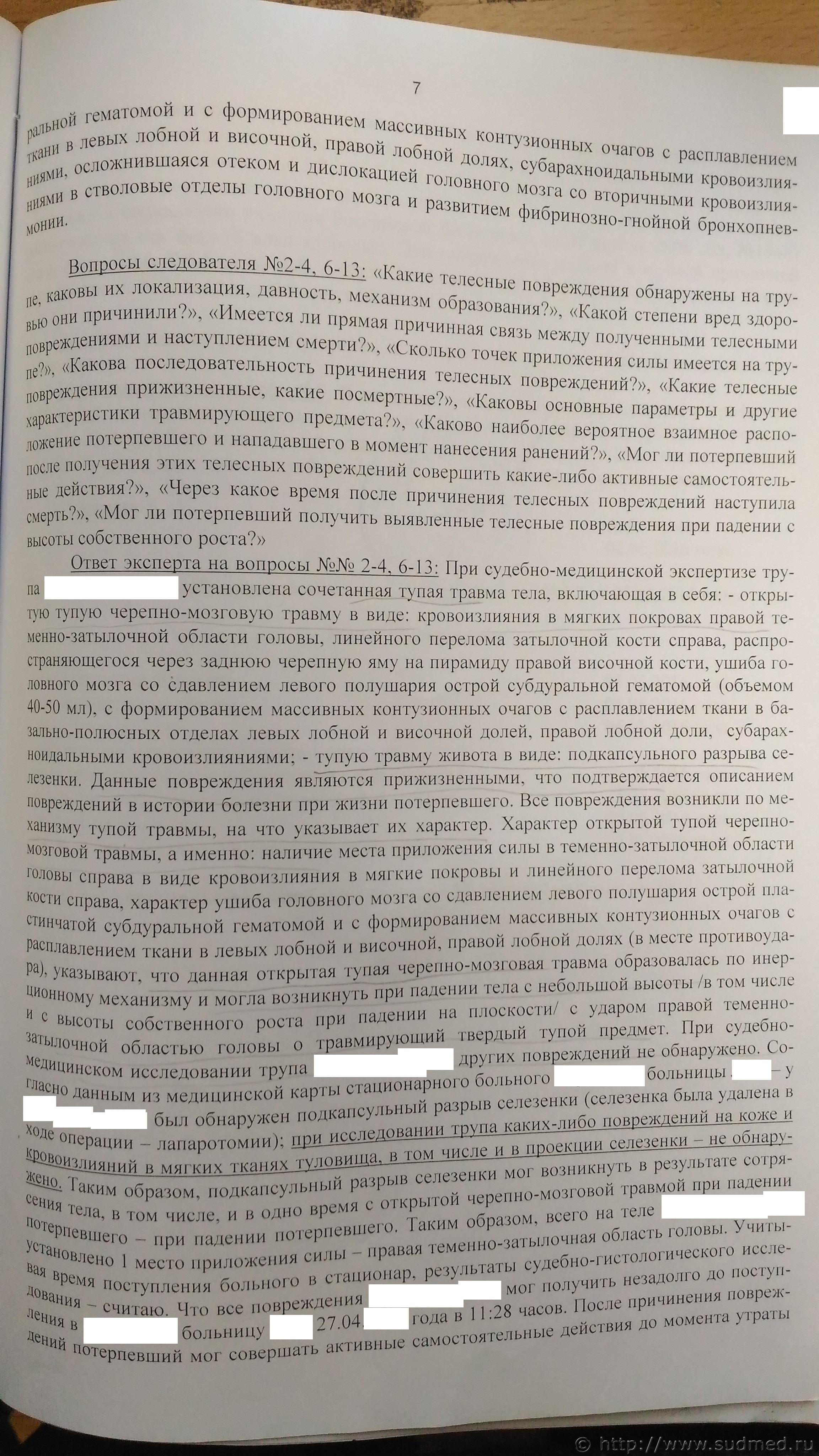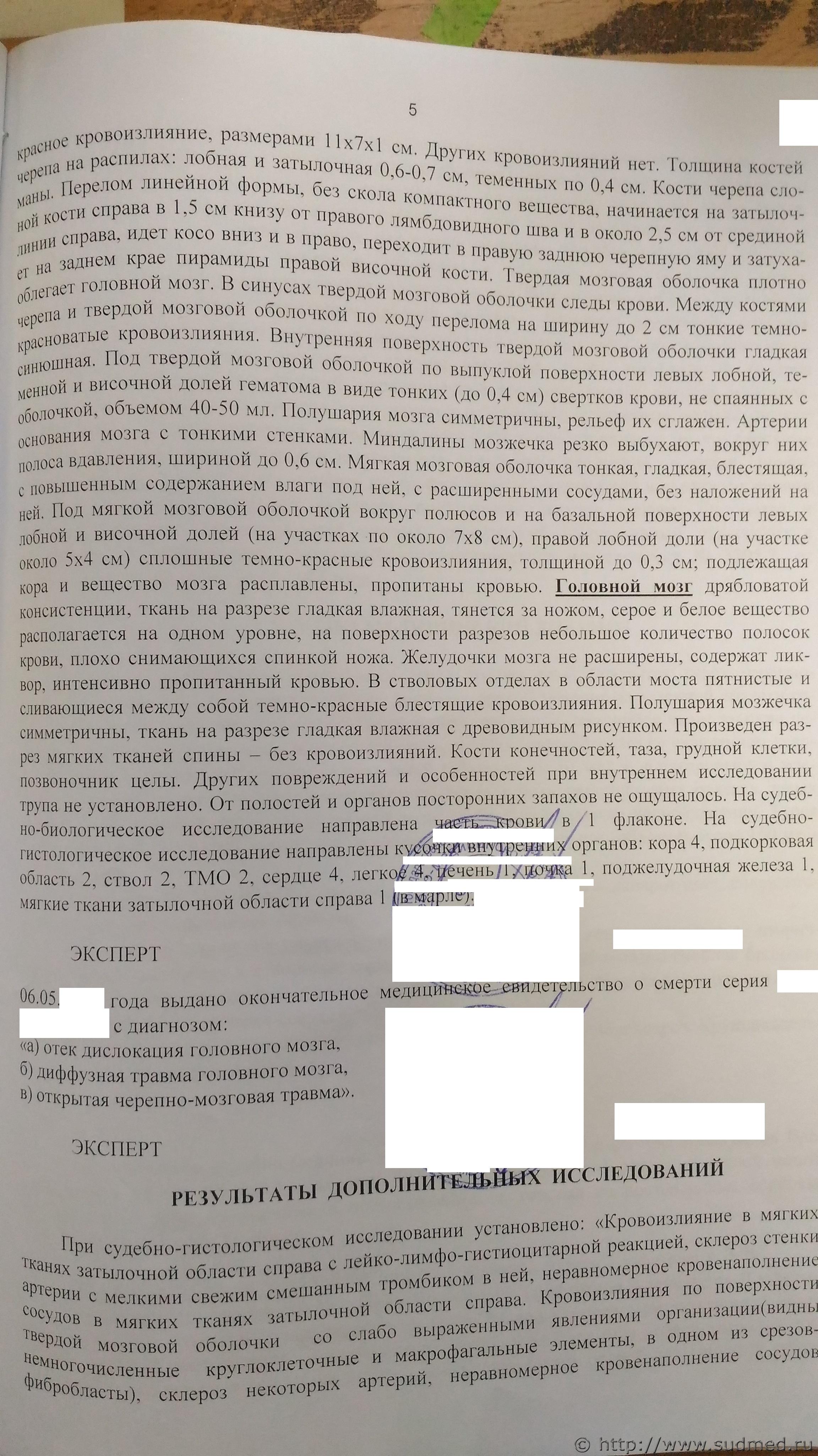 Я согласна с выводом эксперта,там всё написано сухим медицинским языком.По этой причине у меня и возникли вопросы.Подскажите ,пожалуйста, ОЧМТ подразумевает рану на голове,правильно я понимаю? Откуда могло взяться столько крови,если он из дома ушёл без повреждений? |