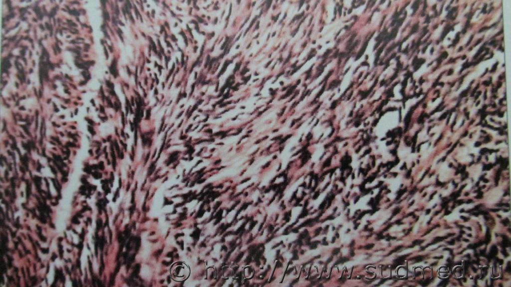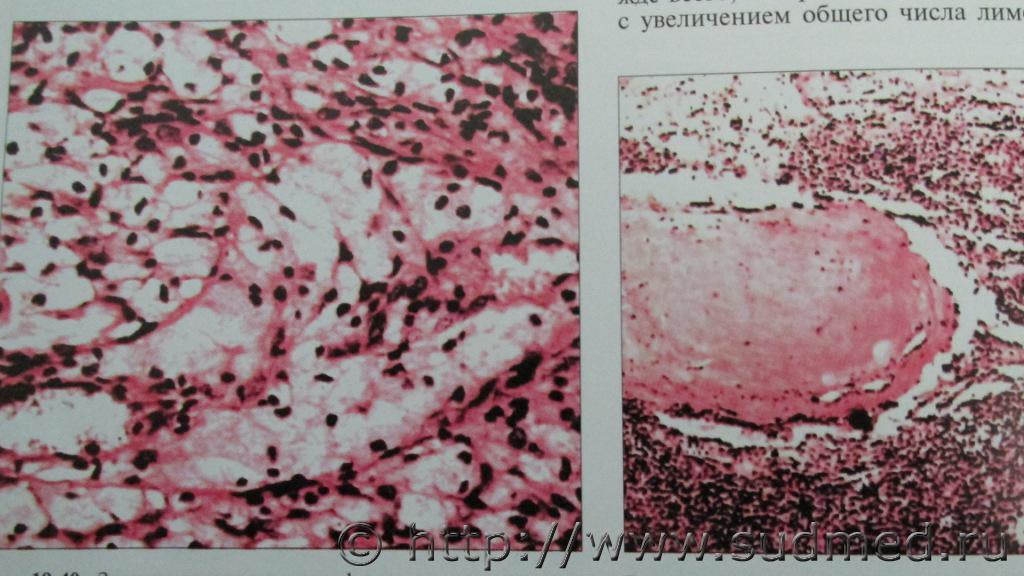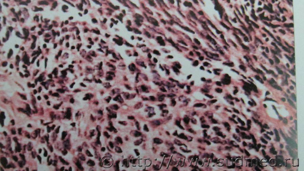 Тимома по типу В3. -периваскулярные щели инфильтрированы лимфоцитами - наблюдается некроз ,тканевой,клеточный и ядерный атипизм, гликогенофильность ввиде эозинофилии в строме и местами в цитоплазме эпителии опухоли. Возможно при жизни страдал миастенией...