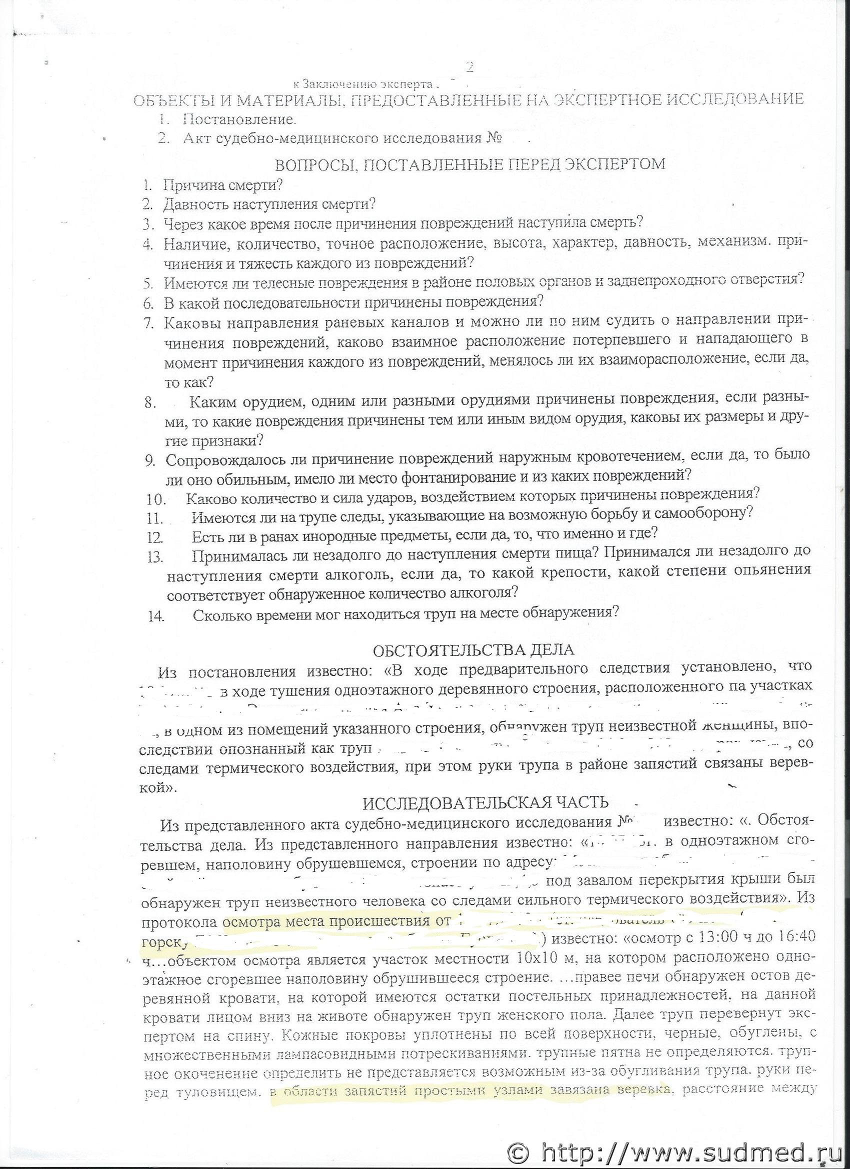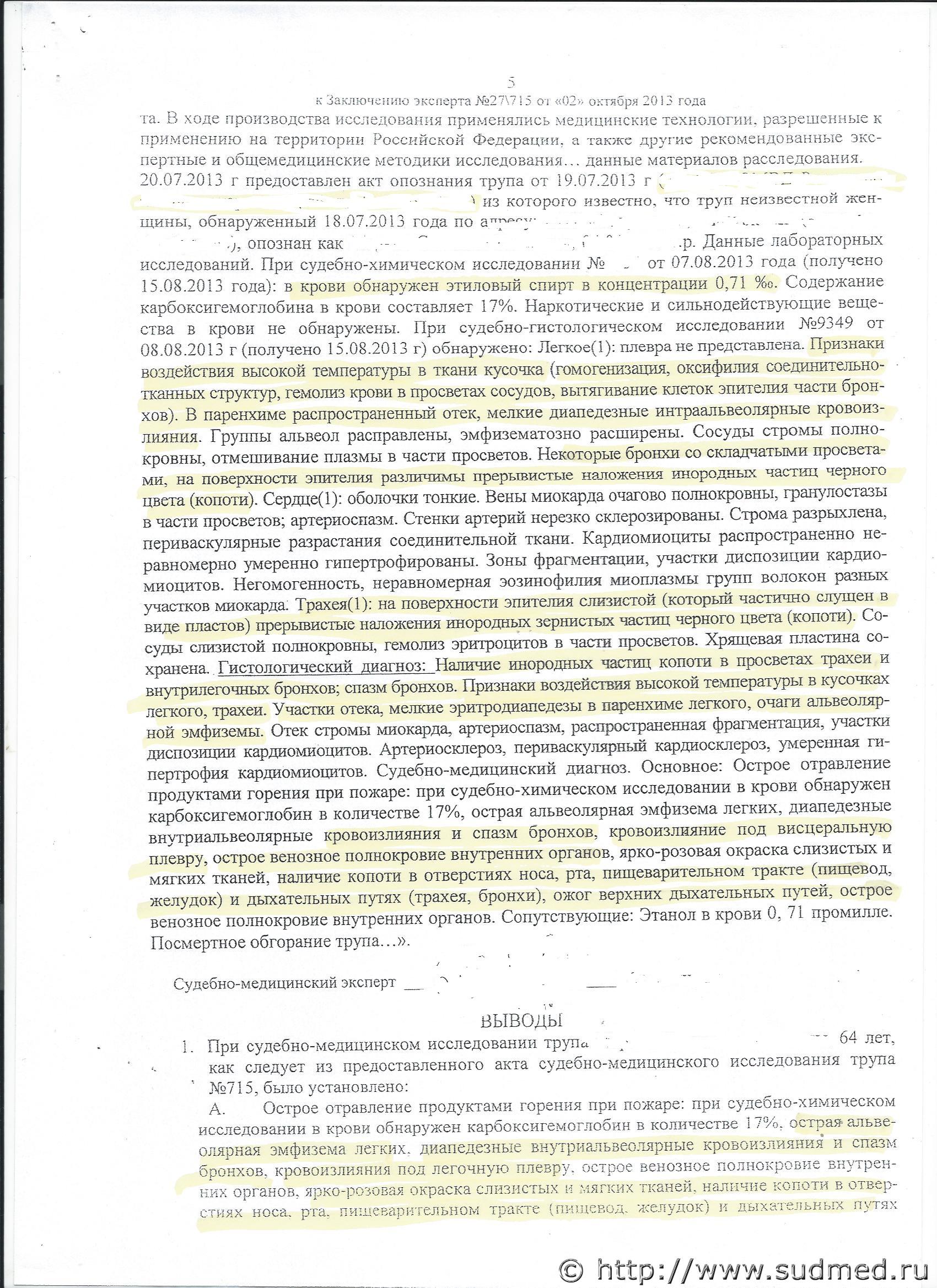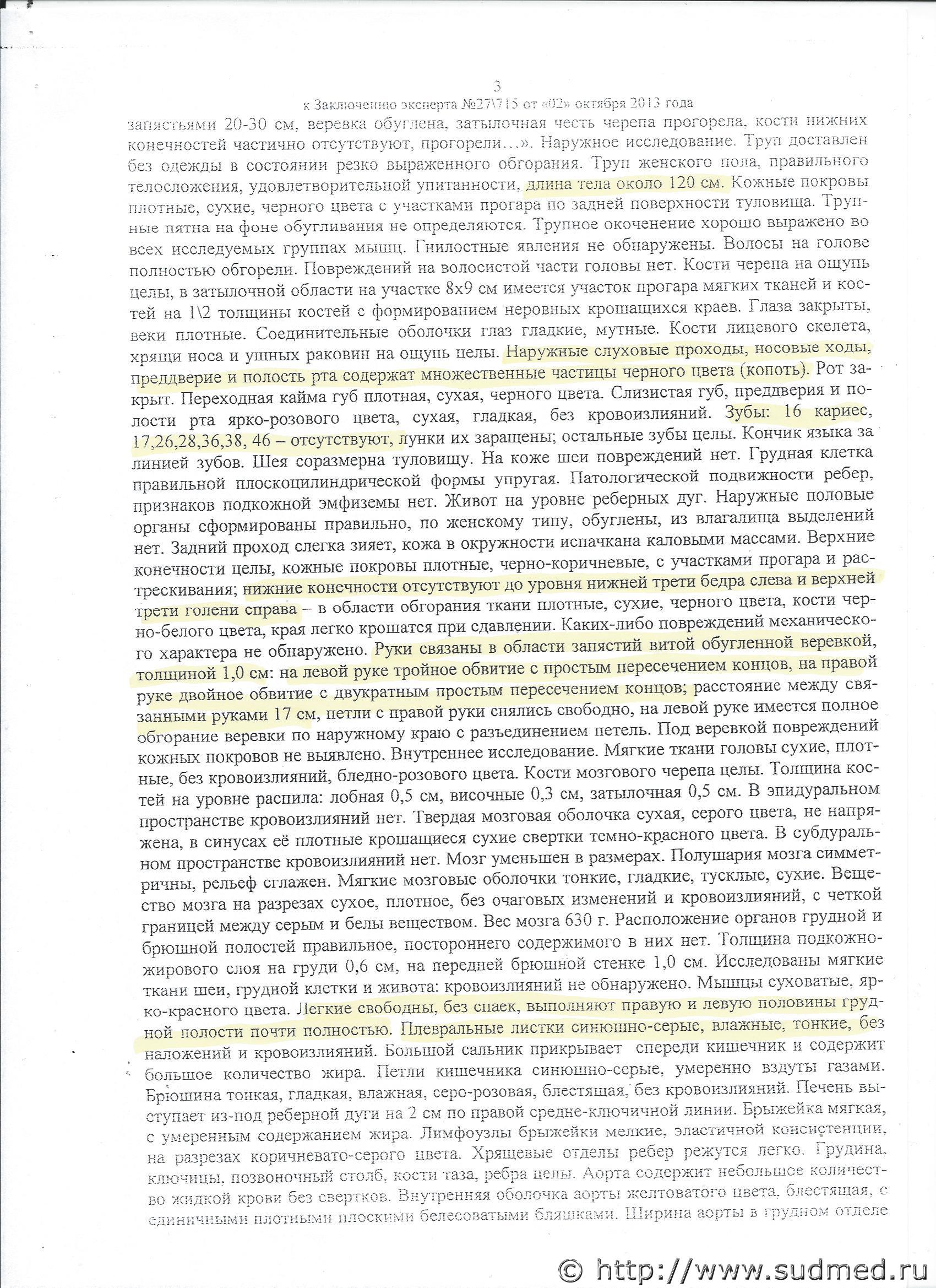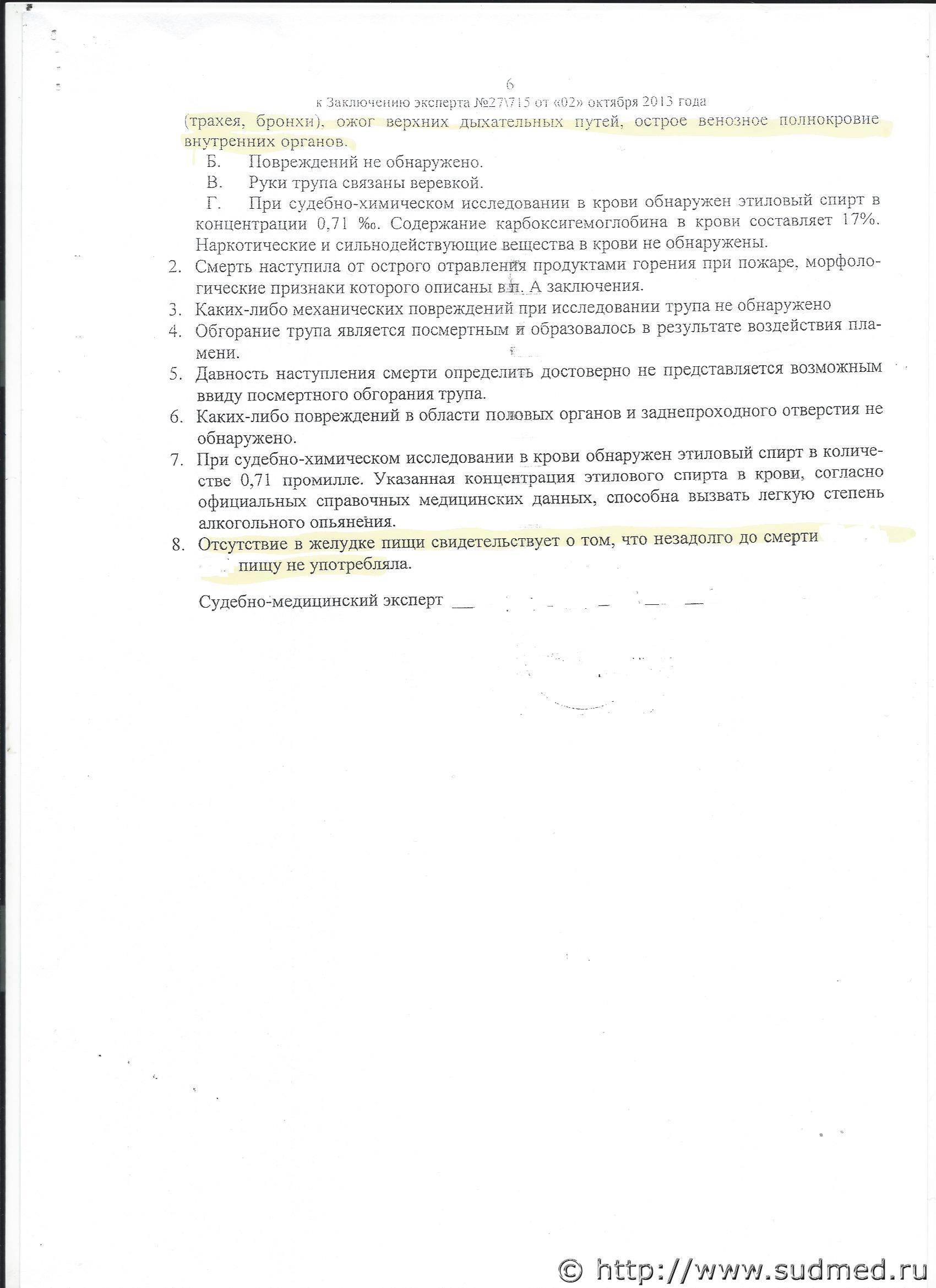 Я являюсь потерпевшим по уголовному делу. Пытаюсь ходатайствовать перед следствием о переквалификации ст. 105 ч.1 "умышленное убийство", на ч.2 п. "д" - "убийство, совершенное с особой жестокостью". Мне отказывают и отвечают, что по СМЭ моя мать формально "отравилась продуктами горения" и, соответственно тут якобы нет "особой жестокости". Я понимаю, почему СК так себя ведет, так как после такой переквалификации приостановить следствие будет намного сложнее и контроль могут поставить построже. Мне мешает согласится с тем, что ч.2 п. "д" ст. 105 отсутствует, так как по результатам СМЭ мной понимается, что все же совершено убийство с особой жестокостью. Поскольку моя мама была умышленно связана, облита бензином и заживо сожжена. Дело еще в том, что я обучался на фельдшера скорой и у меня была практика в ожоговом центре им. Вишневского. Там мы вскрывали в основном трупы, обгоревшие после пожаров и я помню, что паталогоанатом натаскивал нас очень серьезно и учил, что в подавляющем большинстве случаев, даже если человек горел заживо, как это не было нам удивительно, причиной смерти будет скорее всего установлено отравление, а не ожоги. Так же нас учили распознавать прижизненные и посмертные признаки влияния огня на тело и другим вещам. В СМЭ я усматриваю множественные признаки убийства с особой жестокостью. И по СМЭ, которое я прилагаю, я вижу, что было воздействие высокой температуры на внутренние органы, что моя мама получила прижизненные ожоги трахеи, бронхов, легких, что уже для меня однозначно говорит о ч. 2 "д". При этом, как мне кажется что даже официальная версия "отравление продуктами горения" в связанном виде тоже говорит о ч.2 п."д". так как угарный газ это так же яд и вызывает мучительную смерть. И его принятие в связанном виде в окружении открытого огня, особое мучение. То есть все равно ч.2 "Д". В любом случай, то что моя мама получила ожоги легких, говорит мне, что это возможно только при нахождении в сознании, при интенсивном дыхании обжигающим воздухом. Когда я говорю об этом в ГСУ, мне отвечают, что вдыхание горячего воздуха не является признаком ч.2 "Д". В некотором смысле, разговор про то, что смерть в связанном виде с присутствием ЛГЖ после умышленного поджога не является убийством с особой жестокостью странны для меня, так как я не могу согласиться с контраргументами ГСУ и считаю, что их же аргументы являются доказательством ч.2 Д. Мне хотелось бы узнать мнение экспертов. Увидят ли судмедэксперты в приводимом СМЭ ч.2 п. "д" с. 105 УК РФ. Поэтому я прилагаю СМЭ по вскрытию. Есть и еще вопросы, если будет позволено я их впишу в пост как апдейт. Например не дает покоя такой вопрос. Я похоронил маму в черном пакете и без опознания, мешок привез гражданин, ставший затем подозреваемым, в этот момент убийство он скрыл, всем сказал что моя мать случайно задохнулась от возгорания вдруг у него в сарае. Уголовное дело на тот момент не было возбуждено. Тело в пакете было примерно размером 160 см. с очертаниями ног и ступней, подозреваемый с помошниками силовым путем не допустили, что бы мы вскрыли мешок. Но по СМЭ я вижу, что от тела осталось 120 см., а ноги сгорели по колени. То есть, кого он привез и что именно там мы захоронили, достоверно не выяснено. Опросил сотрудников ритуальной службы. Они отвечают, что в подобных случаях никогда не подкладывают никаких имитаций. Но 