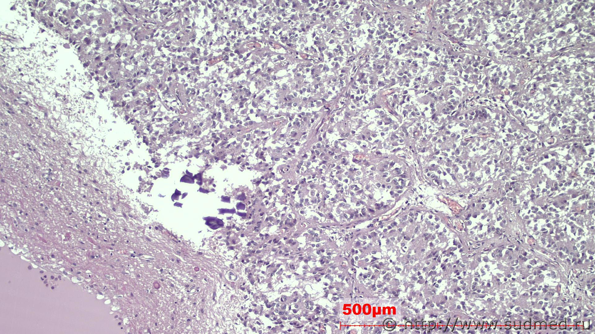 Киста с желеобразным беловатым содержимым около 1 см диаметром. На передней поверхности ствола мозга между мостом и средним мозгом. Мужчина, 39 лет. Эскизы прикрепленных изображений |