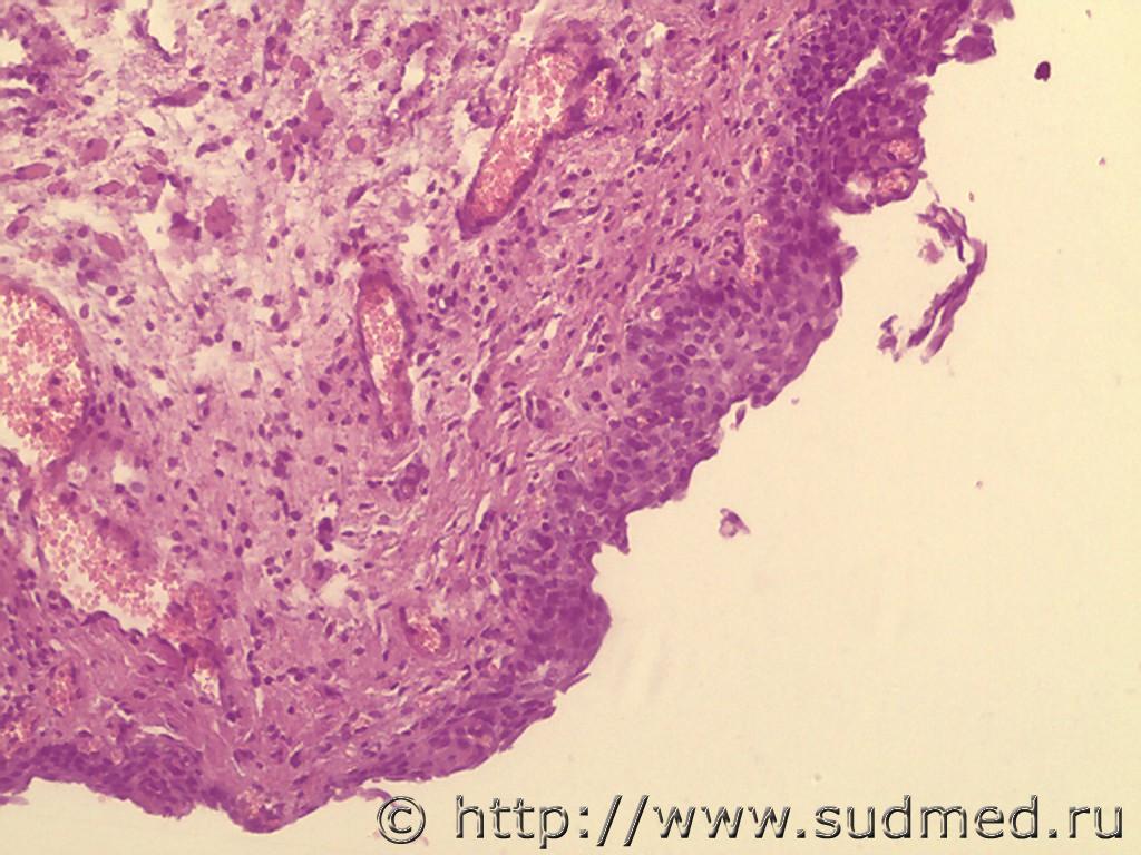 Наблюдаеься темносиние включения, как колонии микробов и округлые как грибковые отложения в слизистой. Далее в подслизистой инфильтрация лимфоцитарно- плазмоцитоклеточная инфильтрация и кистознорасширенные полости. Что то с аллергической связано. М.б.аллергический эзофагит на какие то вещества.