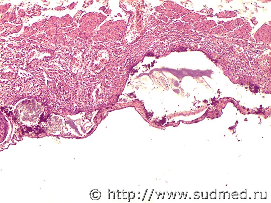 Уважаемые коллеги, помогите разобраться что с пищеводом на препаратах?. Исследую случай ребёнка, умершего от пневмонии, сепсиса и шока в больнице. При исследовании пищевода танатолог описывает полосовидные кровоизлияния тёмно- коричневого и чёрного цветов. В микропрепаратах многослойный эпителий местами резко истончён, отслоен с формированием полостей (как при ожогах...), а в полостях какие-то чёрные массы, а также базофильные структуры, похожие то ли на каких- то паразитов, то ли грибов...не пойму что это такое....Помогите!!!
