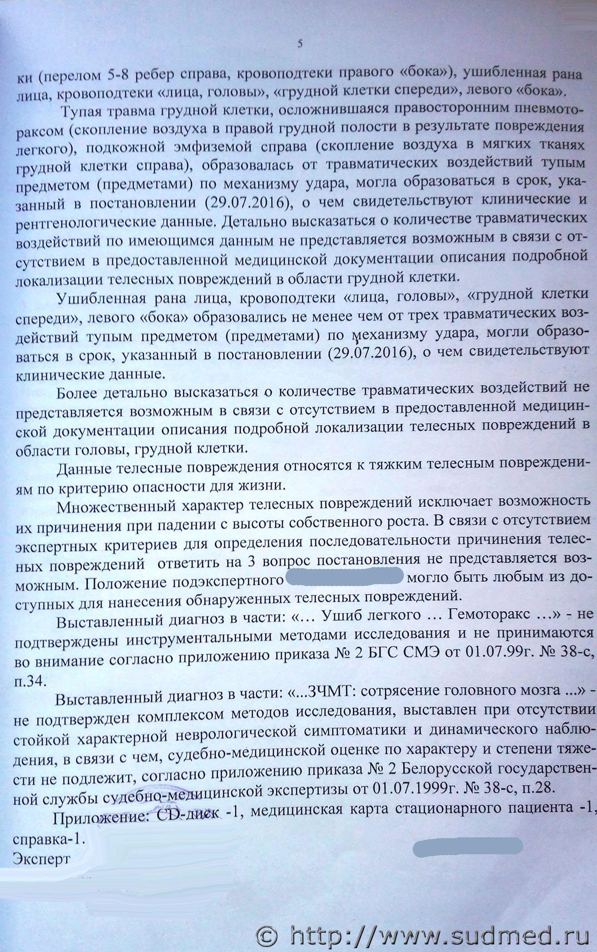2. С точностью до минут и часов - невозможно. Указанное Вами ночное и вечернее время не исключаются. Эксперт дал ответ относительно указанного в постановлении времени. Оно не исключается. Ответ не противоречит имеющимся медицинским данным. 3. Переломы с пятого по восьмое ребро по средней подмышечной линии справа не могли образоваться при падении с высоты собственного роста на плоскость. 4. Фактически здесь есть: достоверные рентгенологические признаки пневмоторакса (воздух в плевральной полости из-за разрыва легкого), клинические признаки дыхательной недостаточности (одышка), обширная эмфизема мягких тканей груди, видимая на рентгенограммах и наблюдавшаяся клинически. Вполне достаточный комплекс клинико-рентгенологических признаков. 5. См.ответ на вопрос №2. 6. Надо смотреть снимки. Описание переломов в заключении весьма поверхностно сделано, по нему невозможно достоверно судить о давности переломов ребер (не описано состояние рентгеновской щели перелома, краев и углов отломков, костной ткани вблизи линии перелома, наличие или отсутствие признаков формирующейся фиброзной или костной мозоли и т.д.). Само по себе это может быть основанием для ходатайства о назначении дополнительной или повторной экспертизы с участием эксперта-рентгенолога. 7. Считаю, что нарастающий пневмоторакс (являющийся признаком разрыва легкого) с признаками дыхательной недостаточности (одышка до 24, бледен - на фоне алкогольного опьянения!) - достаточное основание считать травму опасной для жизни. То, что травма не закончилась смертью - случай, а закономерный исход - с высокой вероятностью печальный (про это есть много в клинической и судебно-медицинской литературе). На самом деле, тут есть о чем подискутировать в процессе, показывая перед клиентом работу защитника, но поменять вред не получится. 8. Непосредственно в момент получения травмы пневмоторакса еще нет. К примеру, человека ударили ногой по ребрам, грудная клетка прогнулась, легкое, наполненное воздухом, разорвалось или повредилось отломком ребра. Все это - в момент травмы, исчисляемый малыми долями секунды. Действие травмирующего объекта (ноги) прекратилось. Из разорванного легкого постепенно начал выходить воздух и пневмоторакс стал нарастать. По причине своего возникновения - "травматический" (вследствие травмы, а не от какого-то заболевания: туберкулезом или раком легкого, например). "Посттравматический", потому, что развивался уже после травмы. Я пишу "травматический", что бы господ юристов не вводить в ненужные размышления. Если написать "посттравматический", то, в общем-то это тоже не ошибка. Что в лоб, что по лбу - нет большой разницы. |