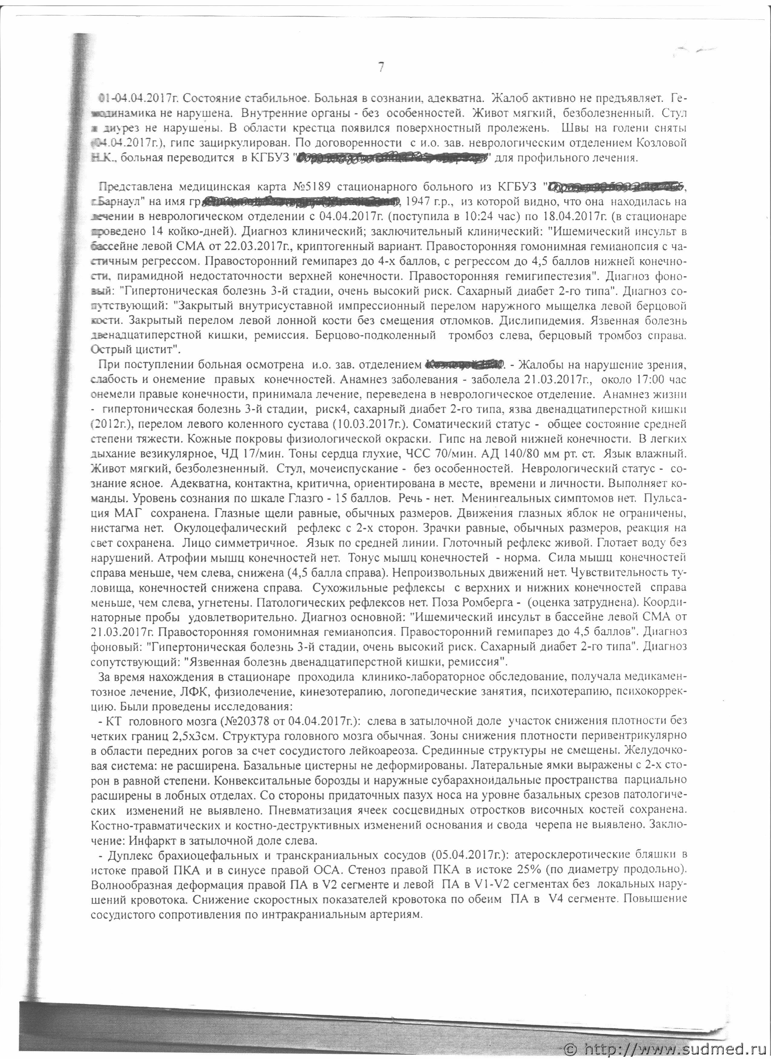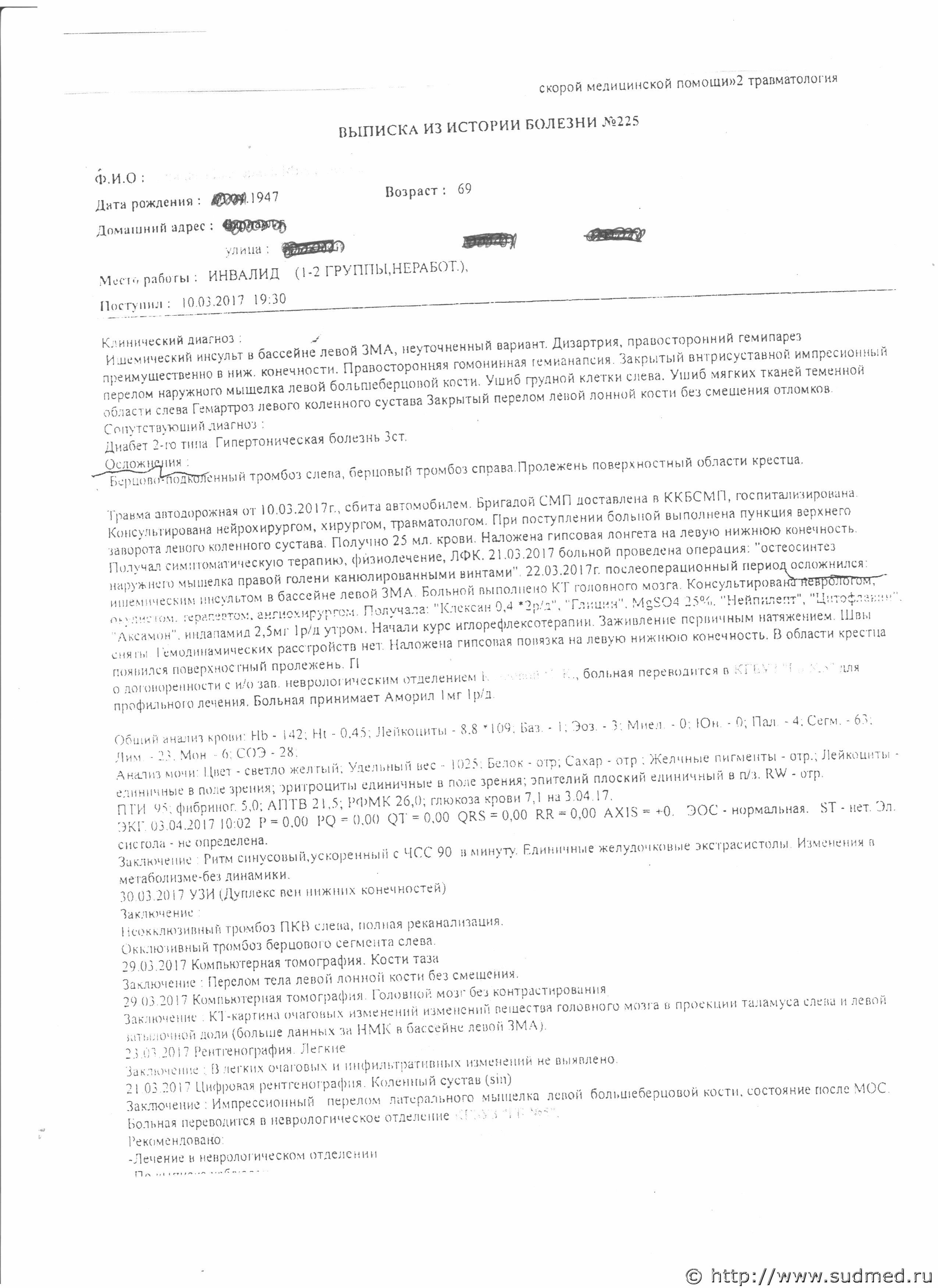Мою маму сбила машина на пешеходном переходе на зеленый свет. В больнице СМП были поставлены диагнозы: перелом лонной кости, перелом наружного мыщелка левой голени со смещением, ушиб мягких тканей теменной области слева, ушиб грудной клетки слева. Первоначально ставился также диагноз закрытый вколоченный перелом шейки левого бедра. Во время операции на голени по установке винтов случился инсульт. Мама лежала в больнице с момента травмы до операции 13 дней. После инсульта ей сделали дуплекс вен и обнаружили берцово-подколенный тромбоз слева (в месте травмы). В проведенная СМЭ инсульт не связывают с последствиями ДТП. Эксперт также игнорирует диагнозы лечащих врачей: ушиб мягких тканей теменной области слева и ушиб грудной клетки слева, которые могли быть причиной инсульта. В выписке БСМП прямо указано на то, что инсульт-это осложнение травмы. Никогда ранее до травмы никаких проблем с тромбами или мозговым кровообращением у мамы не было. После инсульта у мамы парез всей правой части тела, выпадение поля зрения справа. Была очень активным человеком до ДТП, сейчас из дома даже не выходит, боли, слабость. Лечили инсульт еще в двух больницах. Лечимся на дому постоянно. Толка почти нет. Эксперт относит травмы лишь к средней степени тяжести. Можно ли отнести инсульт к последствиям ДТП? Возможно ли квалифицировать повреждения, как тяжкие?