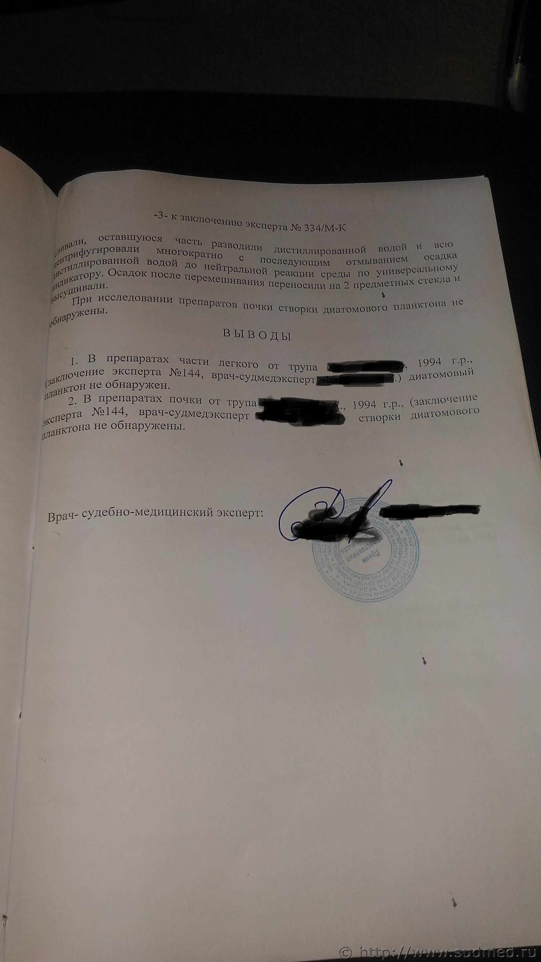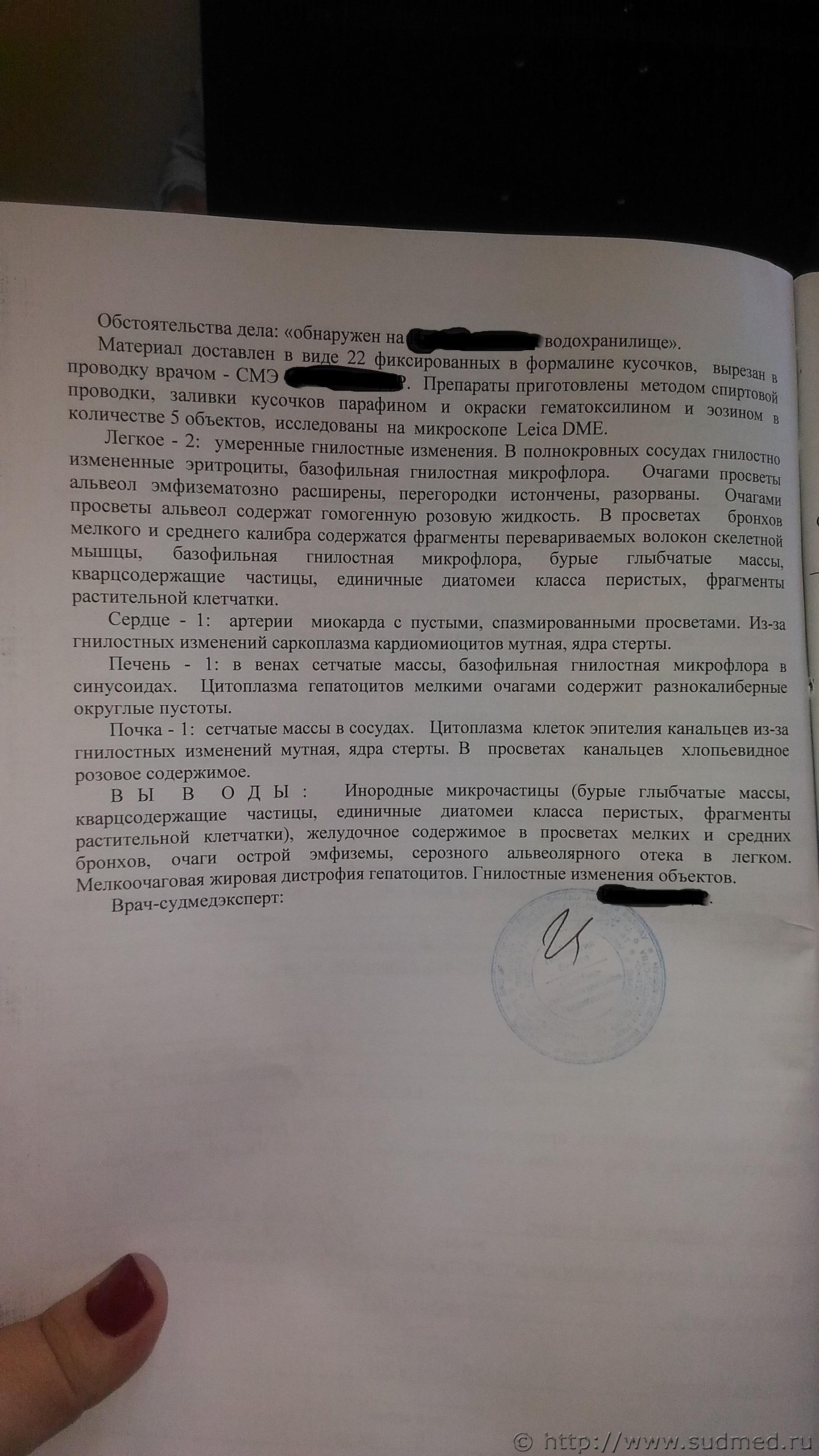 Здравствуйте! 01.08 пропал брат, 05.08 всплыл в стоячем водоёме( водохранилище),на мелкой глубине по пояс воды при росте 165 см(проверено лично) температура наружного воздуха была около 22 градусов, всплыл в вещах( футболка,джинсы,ремень,плавки, но без носков и обуви), всплыл боком, руки вытянуты верх полусогнуты в локтях, пальцы полусогнуты,ноги растопырены- правая нога полусогнута, напоминает" боксёрскую стойку"(брат некоторое время занимался рукопашным боем),рот приоткрыт,губы вытянуты вперёд, глаза закрыты,на лице имеются явные следы побоев, а конкретно гематом с правой стороны лица над глазом,под глазом и именно правая часть лица красно-розово фиолетового цвета, левая сторона просто темного цвета,на веках скопление свежей крови,голова чуть вздернута вверх и повёрнута вправо,тело естественного светло-смуглого цвета,кроме шеи, всей головы,лица и левой руки.Работники морга не держали его в холодильнике,в чём убедилась лично, т.к. его обнаружили в субботу, вскрытие проводилось в понедельник, я лично была в морге в субботу в вечернее время, и убедилась,что лежал он обмотанный в вещах,в простыню и в шерстяное одеяло( вероятнее всего чтобы тело быстрее разлагалось ,чтобы оставалось меньше улик преступления) голова также была повязана узлом в шерстяное одеяло, в данной комнате было очень тепло и помимо этого было открыто наружнее окно,на улице также было больше 20 градусов по Цельсию. Анализы на планктон,на большую химию ,и гистологию были доставлены в бюро смэ в другой город 10.08( хотя расстояние м/у городами 200-250 км. и в этот день было ещё несколько вскрытий). В итоге, написали ,что на гистологию были взяты: головной мозг -3, сердце-4, печень-1,почки-2,надпочечник-2, селезенка-1, поджелудочная железа-1, желудок -1,кусочки залиты 10% раствором формалина.а в итоге на гистологии изучались легкое-2,сердце-1,печень-1, почка-1.ВЫВОДЫ: Инородные микрочастицы(бурые глыбчатые массы,кварцосодержащие частицы,единичные диатомеи класса перистых,фрагменты растительной клетчатки),желудочное содержимое в просветах мелких и средних бронхов, очаги острой эмфиземы,серозного альвеолярного отека в легком.Мелкоочаговая жировая дистрофия гепатоцитов.Гнилостные изменения объектов. А в легких и почках диатомовый планктон не обнаружен. Причина смерти механическая асфиксия в результате утопления.