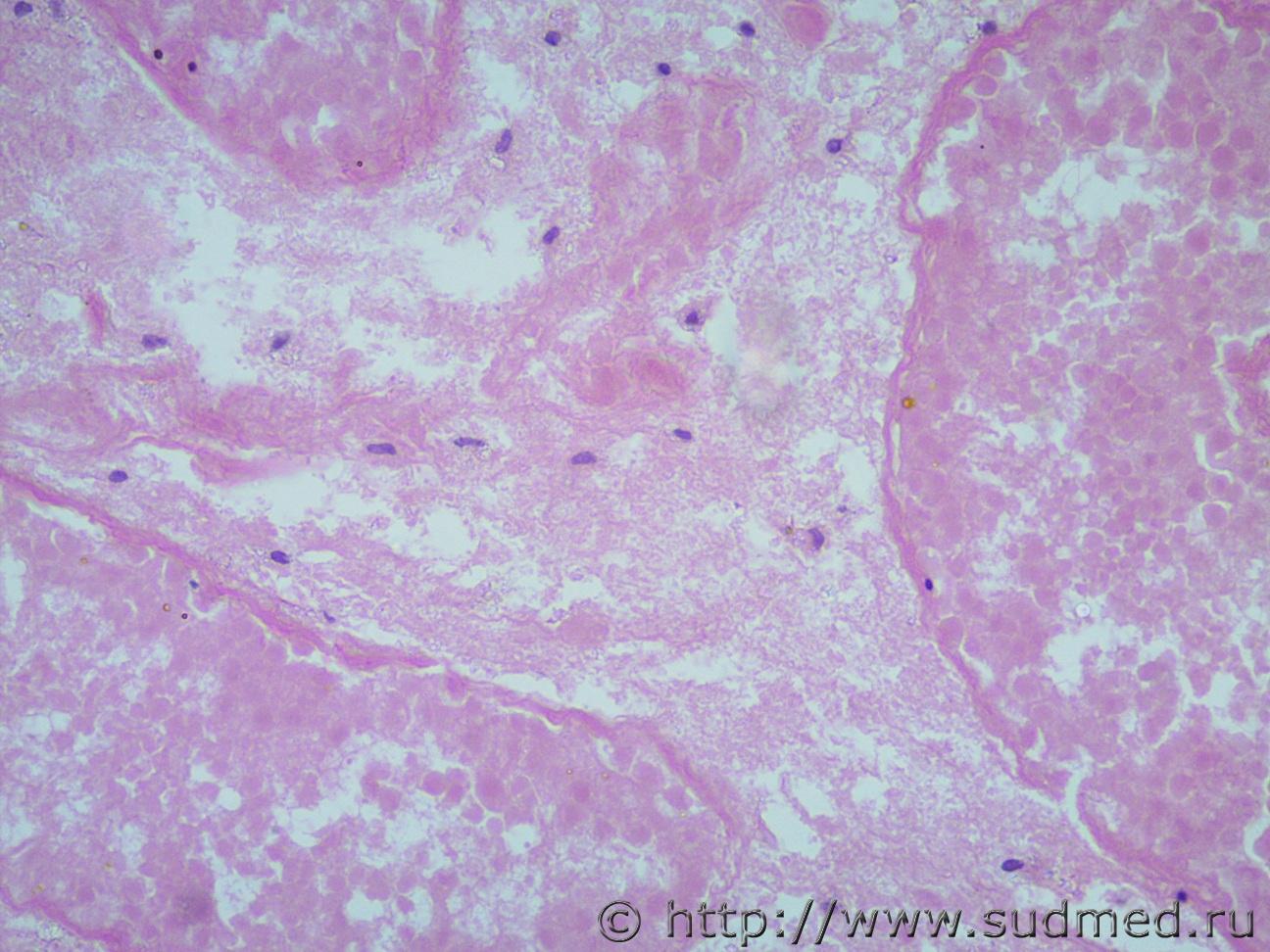 Ув. коллеги нужна помощь. У мальчика 15 лет появились резкие боли в правой половине мошонки. ДЗ: орхоэпидидимит справа. Данных за перекрут канатика нет. 1,5 мес. консервативного лечения и повторные УЗИ (некротически измененный придаток?) с выраженным его увеличением в объеме. Операция: высокая орфофуникулоэктомия справа по поводу перекрута и некроза правого яичка. Необходимо установить давность некроза яичка. 1-5 белочная оболочка и ткань яичка