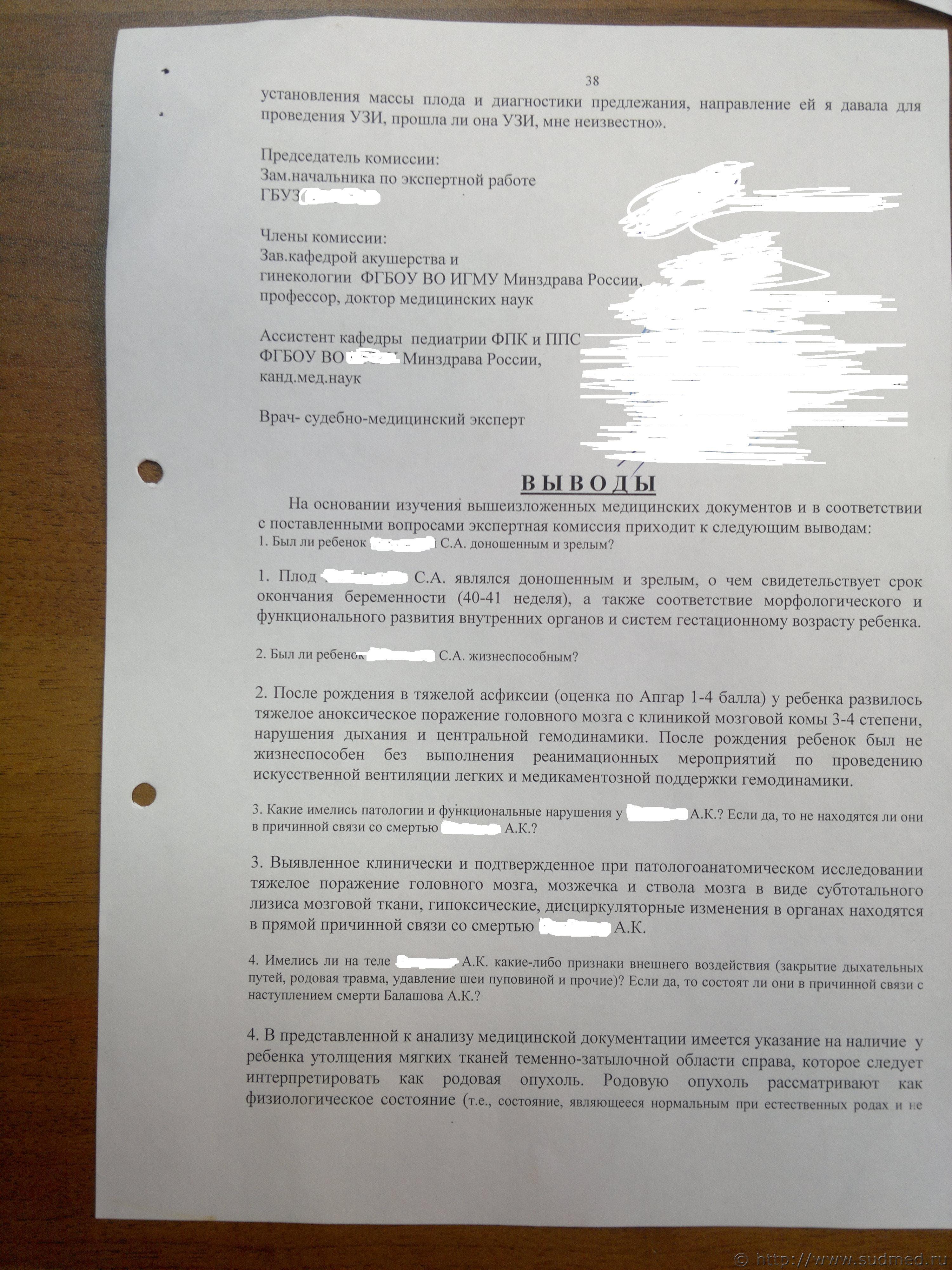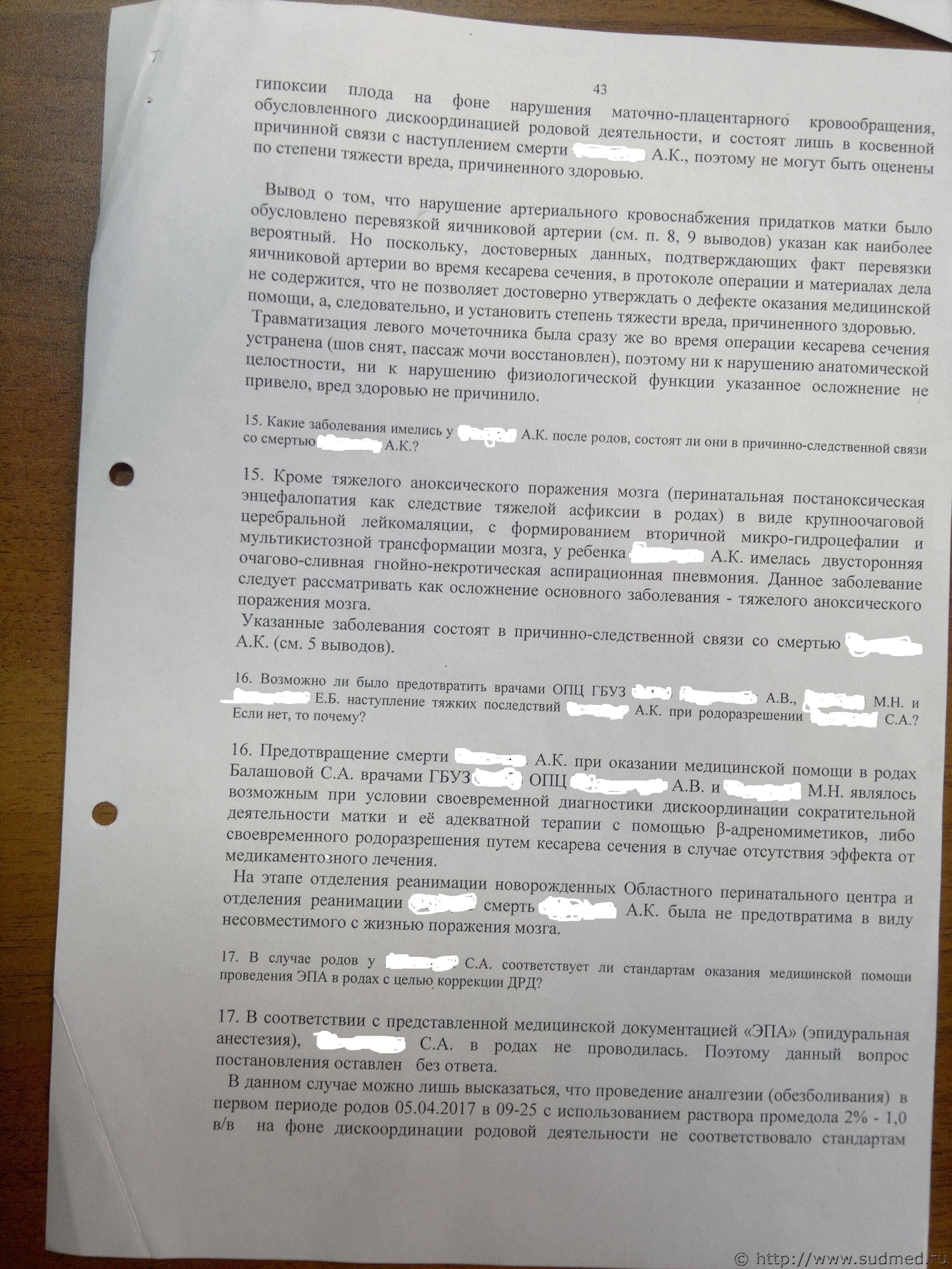 Без 44 листа могу утверждать, что выводы аргументированные и обоснованные. Не понял, о каком сокрытии удаления придатков идет речь - в истории родов ничего не спрятано. после операции врач не сказал роженице, что у нее был удалён яичник и одна труба, историю родов на руки никто не давал даже для ознакомления. Родоразрешение происходило в другом городе, не по месту жительства роженицы, после выписки из больницы роженице историю не давали, в больницу по месту жительства история не поступала. Об удалении она узнала спустя время у другого врача на УЗИ, саму историю увидела уже в данной экспертизе. Я не юрист и не медик, поэтому конечно могу не совсем правильно понимать и трактовать произошедшие события. Я не знаю обязан ли был врач поставить в известность роженицу после операции, что органы были удалены. Для меня не понятны остались выводы эксперта. На вопрос 8 и 9 эксперт отвечает, что родовспоможение происходило с рядом нарушений, что привело к прогрессирующей гипоксии плода. Однако (ответ 13) нарушения допущенные врачами состоят лишь в КОСВЕННОЙ связи со смертью ребёнка. Вопрос 16 можно ли было предотвратить смерть ребёнка, ответ-да. Ответы 13 и 16,на мой непофессиональный взгляд, протеворечат друг другу.Ответ 19- показаний к плановому кесареву не было. А как же крупный плод?Плацентарные нарушения, которые не были выявлены своевременно? Ответ 14- вред здоровью роженице не приченён. Приказ Минздавсоцразвития №194н раздел II п.6.1.21- определяет удаление яичника как тяжкий вред. Разве при кесаревом сечении показано удаление яичников? показатели здоровья до родов предполагали такую возможность? Повторюсь, я не врач, не юрист, я подруга роженицы, могу ошибаться, именно поэтому и обратилась на форум за помощью. Уголовное дело собираются закрывать- вред здоровью не причинён, вина врачей лишь косвенная |