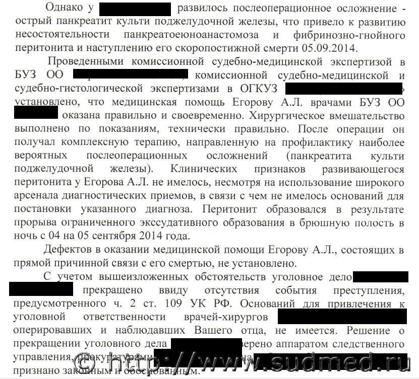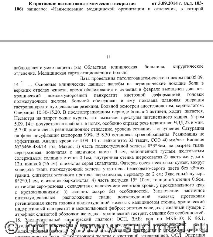 Здравствуйте. Меня зовут Дмитрий. Я сын покойного ЕАЛ сконавшегося при проведении планой операции по удалению кисты с пожделудочной железы диаметром 10 мм в больницу №3. Мой родной отец, проядя бесплатную диспансеризацию в больнице №1 узнал что у него киста на поджелудочной желеге лисметром 10мм, ему дали направление в онкологический диспансер(больница №2) где подтвердили наличие кисты и отсутвие оклогоии. Перед поступлением в Орловский онкологический диспансер , мой отец самостоятельно прошел дополнительное УЗИ в коммерческой клинике. Киста диаметром 10мм на поджелудочной была подтверждена. Мой отец считал что, в связи тем что киста очень маленькая и состояние здоровья у него было хорошим, он думал что операция ему ничем угрожать не может, пошел в больницу №3 на операцию. Мой отец никогда не испытвал проблем с поджелудочной железой и не болел хроническим панкреатитом. Никакого "букета" заболеваний которые ему припасли после его смерти у него небыло. У него была язвенная болезнь желудка и он пил мезим. Мой отец следил за своим здоровьем и именно поэтому пошел на деспансеризацию и выполнил все назначенные ему врачами процедуры. Конфликтов с людьми никогда не испытвал, не судим, был уважаем многи людяьми и сам их уважал, прожил почти всю свою жизнь на дальнем Востоке, где климат распологает здоровью людей. В больнице№2 мой отец обследовался перед операцией, выяснил что у него онкологии нет и был выписан с диагнозом "Хронический панкреатит. Киста поджелудочной железы". О чем свидетельсвует запись в согласии подписанным моим отцом в Орловской Областной клинчиеской больнице. Наверное, в связи с отсутсвием у моего отца каких либо жалоб на здоровье кроме язвенной болезни желудка, поставленный диагноз хронического панкреатита можно было при необходимотси оспаривать, но такой необходимости небыло. Никаких хронических заболеваний у моего отца небыло, если только киста и являлась причиной хронического панкреатита. Как, если человек не жалуется и ему никогда не назначались лекартства от панкреатита, может чемто болеть включая панкреатит я не представляю. Претезий к медицинским услугам оказанным моему отцу сотрудниками больниц №1 и №2 у нашей семьи нет. Спасибо всем докторам и медсестрам этих больниц за оказаывемые ими услуги. Получив направление в больнице№2, мой отец обратился в больницу №3. И поступил с диагнозом "Киста поджелудочной железы. Хронический панкреатит" на плановую операцию. Операцию проводили врачь1 и врач2 Приехал отец в больницу на маршрутном такси с моей Матерью, в отличном самочуствии, нормальном настроении. Мой отец небыл проинформирован о масштабе операции которую ему собирались делать. И если бы он узнал, что ему, например, удалят желчную пузырь полностью и то что удалять чась делудка, однозначно бы отказался от такого лечения. Мой отец ложился в в больницу№3 для проведения операции по удалению кисты с поджелудочной железы, и не для чего больше. Фактически объем проделанной операции оказался намного больше(был полностью удален желчный пузырь, часть желудка и кишечника). Никакого направления в другие больници моему отцу не предлагали, тогда как врач2 в своих показаниях сказал что мой отец якобы отказался от направления для лечения в Москву. Но просили деньги за свои услуги, в Мамошину А.В. и Васьеву М.Ю. мой оте