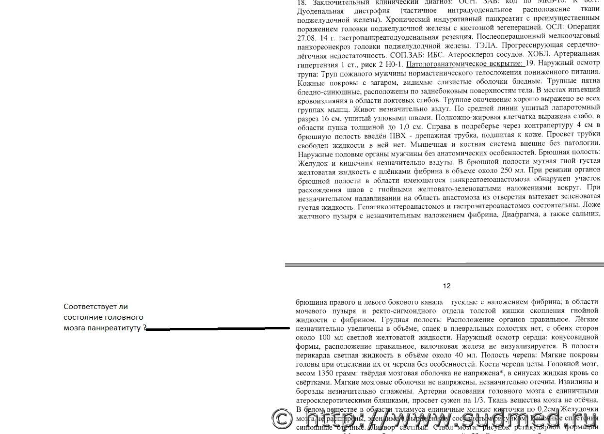 Цитата Можете ли Вы помочь оценить выводы , достоверность (причину смерти, правильно ли ее поставили)... Нет. Заниматься таким единолично - самонадеянная благоглупость или наглое корыстолюбие. Сделать это профессионально и всерьез - большой труд для группы специалистов, включая экспертов клинического профиля. Ходатайствуйте о назначении повторной комиссионной экспертизы в другом Бюро СМЭ. Если это абсолютно не получится - самостоятельно обратитесь с просьбой о проведении соответствующего суд-мед.исследования в любое другое Бюро, на кафедру судебной медицины любого мед.ВУЗа или, в крайнем случае, в какую-нибудь негосударственную экспертную организацию (убедитесь, что там есть лицензия на право выполнения такой работы и реальная возможность привлечения в состав комиссии высоквалифицированных абдоминального хирурга, анестезиолога-реаниматолога, специалиста в области ультразвуковой диагностики). Разумеется, на исследование нужно будет представить все перечисленнные Вами медицинские документы (лучше - оригиналы, допустимо - в виде полных заверенных качественно исполненных копий: что б все записи были ясно видимыми, часть их не выходила за пределы листов, брошюровка выполнена со строгим соблюдением очередности страниц и т.п.). |