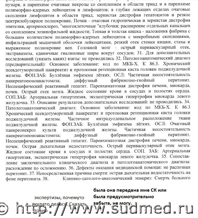 Я сделал скрины с отказа в возбуждении УД и материалов СМЭ проведенных. Прошу Вас посотреть и при возможносоти ответить на следующие вопросы, которые меня волнуют. 1. Не видите ли вы противоречий в документах предосталвеных медиками ? У меня впечатление, что местами они сами себе противоречат. Например, диагноз который поставил доктор 2 и выписал убитого пациена из больници при предоперационном осмотре, который он называет "пациенты обратился из за ухудшения самочустви" и который являлся добровольным желание пациента недопустить ухудшение своего покачто никак не беспокоящего его кистой зхдоровье - "суперсложный панкреатит чето аш вообще жесть" и диагнозом с которым пациент поступил "хронический пакреати. киста поджелудочной железы". 2. Не могли ли же фибрины (это гнойная жидкость если я правильно понимаю) распосостаринится такое количество органов челоека за 1 сутки, как утвержадет врачь 2 ??????? ОН ПРОСТО СЧИТАЕТ, ЧТО ВСЕ ДУРАКИ, А ОН САМЫЙ УМНЫЙ НАВЕРНОЕ И ПОЭТОМУ МОЖЕТ ДЕЛАТЬ ЧТО ХОЧЕТ С ПАЦИЕНТАМИ.... 3. КАК СТОЛЬ УЖАСТНОЕ СОСТОЯНИЕ, ПОЛНОТА УЖАСА КОТОРОГО ВЫЯВЛЕНА ПРИ ПАТАЛОГОАНАТОМИЧЕСКОМ ВСКРЫТИИ, МОГЛОБЫ ПРОТЕКАТЬ БЕССИМПТОМНО И НЕ ЗАМЕТНА ЛЕЧАЩЕМУ ВРАЧУ ИЛИ ВООБЩЕ КОМУ ЛИБО ? У МЕНЯ ПРОСТО СЛОВ НЕТ, КАК МОЙ ОТЕЦ ПРОДЕРЖАЛСЯ ТАК ДОЛГО БЕЗ МЕДПОМОЩИ КОТОРУЮ ЕМУ НЕ ОКАЗЫВАЛ НИКТО ИЗ ВРАЧЕЙ..... 3. Можете ли вы назвать дифекты медицинской помощи которые были оказаны при оказании медпомощи убитому пациенту ? 4. Указывают ли какие либо медицинские данные о наличии этого "злого перитонита". Например я прочитал статью профессора, он пишет что этот "такой" паанкреатит вызвает расстройсто психи очень сильное. Но мой отеч был в трезвом уме почти до самой смерти, тяжело было уже за 1 день до смерти температура поднялась >39 , но бред он не нес никакой. Большоей спасибо. Это пока все вопросы. Если чтото еще впомню, задам, с вашего позволения. Благодарю Всех тех, кто поможет или попытается помочь. Эскизы прикрепленных изображений |